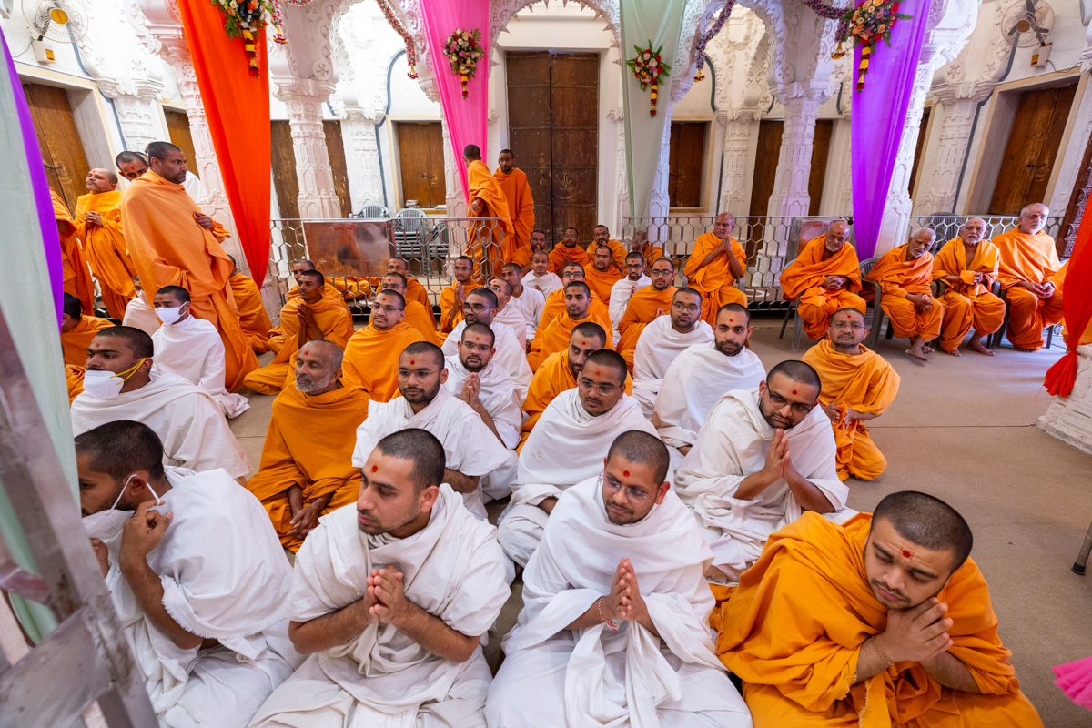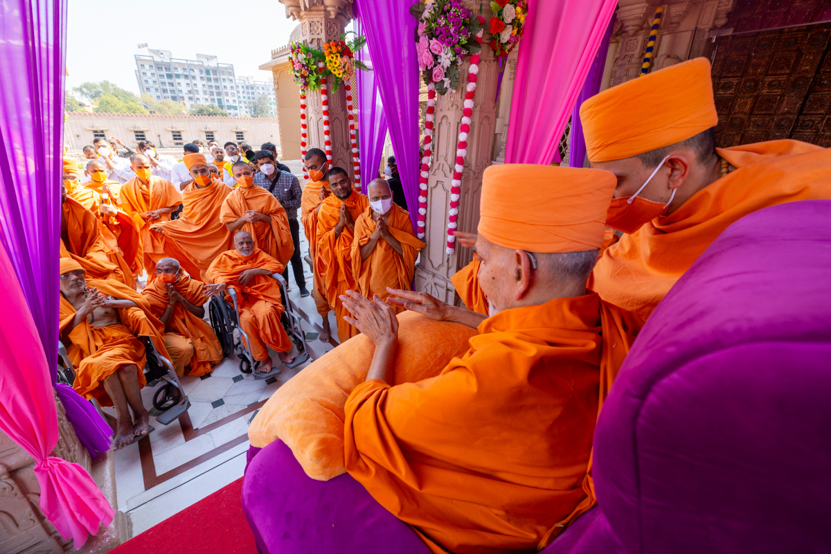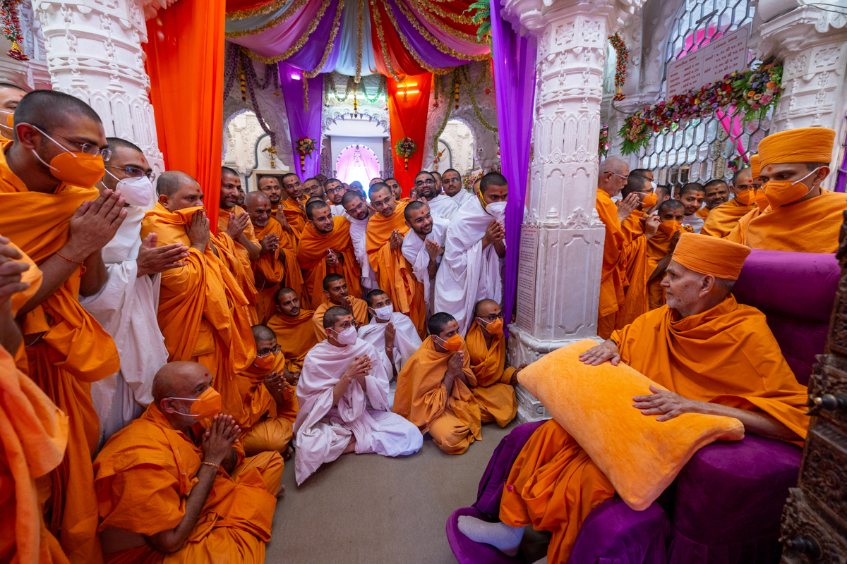 Swamis and parshads doing darshan of Swamishri