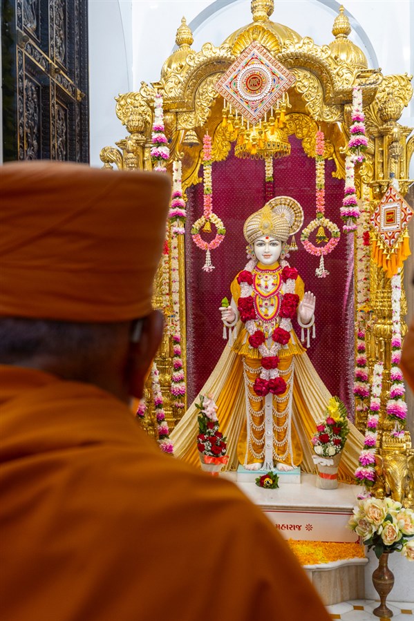 Swamishri engrossed in darshan of Shri Ghanshyam Maharaj