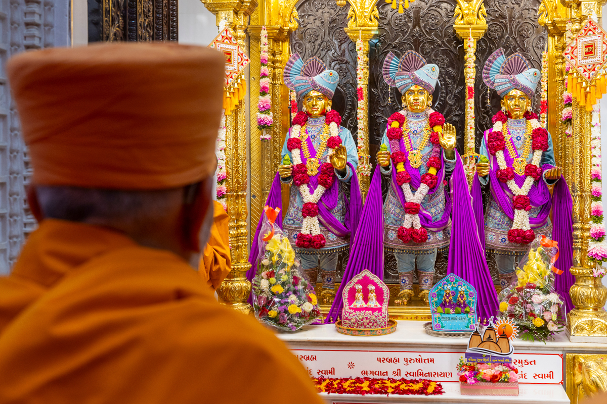 Swamishri engrossed in darshan of Bhagwan Swaminarayan, Aksharbrahma Gunatitanand Swami and Shri Gopalanand Swami