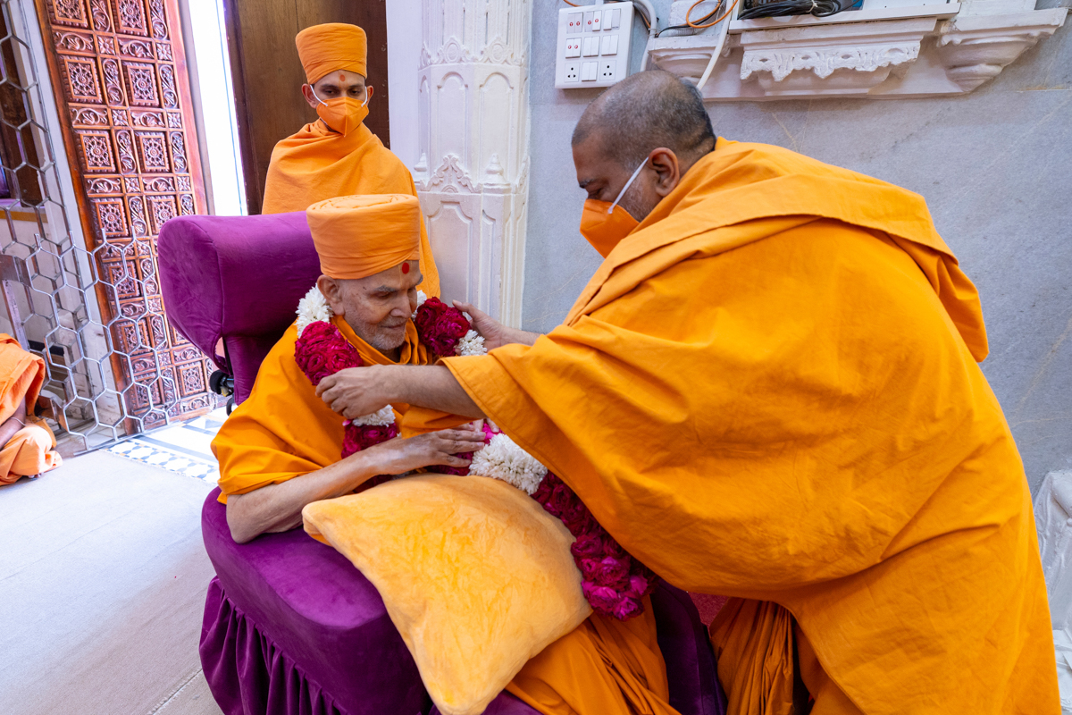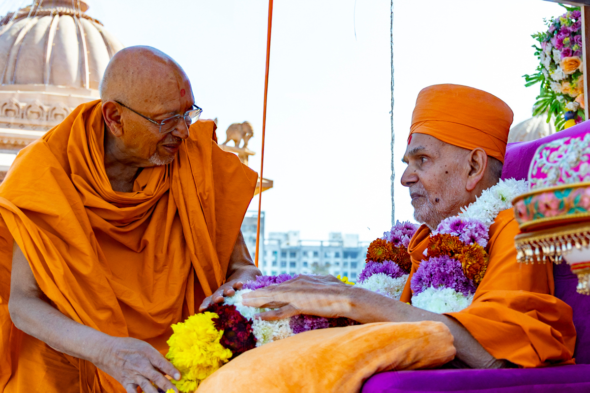 Bhagyasetu Swami and Narayanmuni Swami honor Swamishri with a garland
