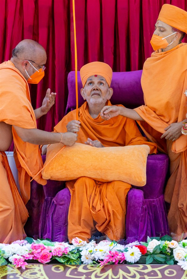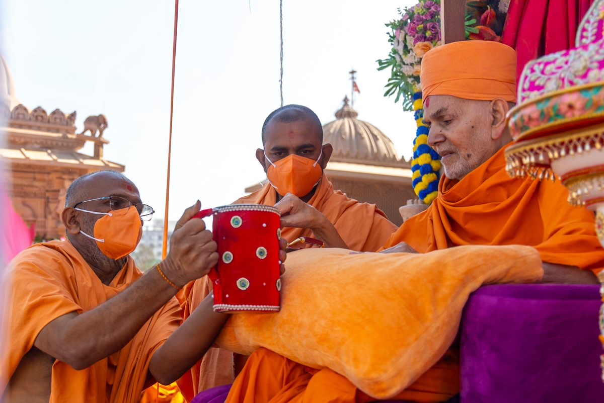 Swamishri sanctifies juice by showering flower petals