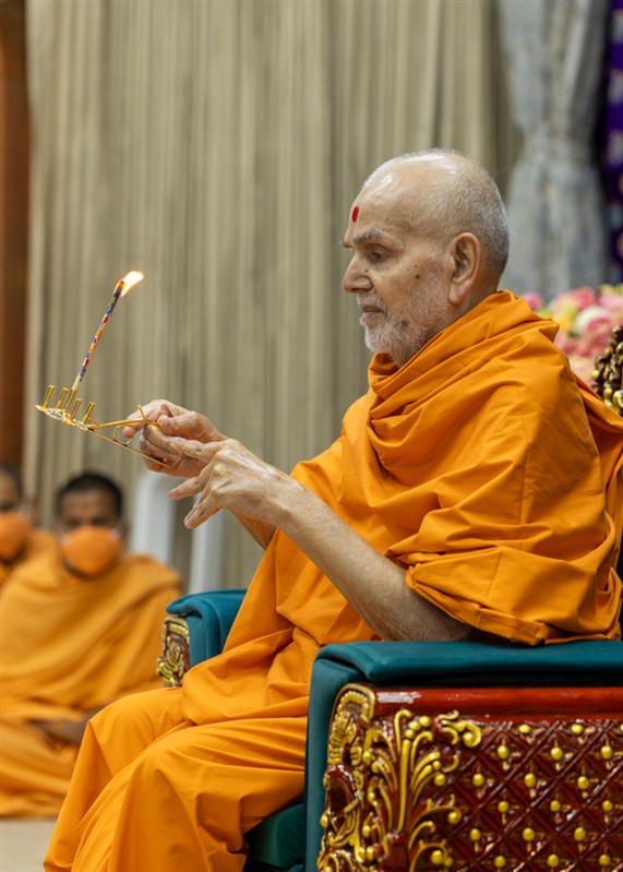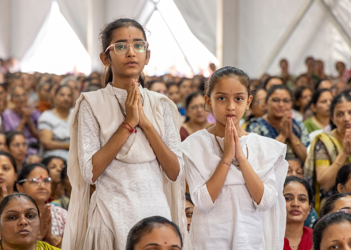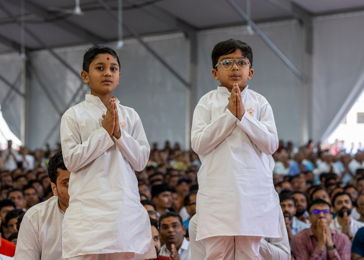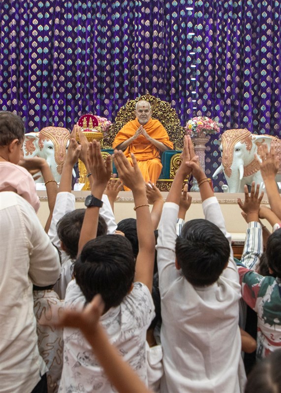 Balaks lead everyone in reciting the sadhana mantra and daily prayer in Swamishri's puja