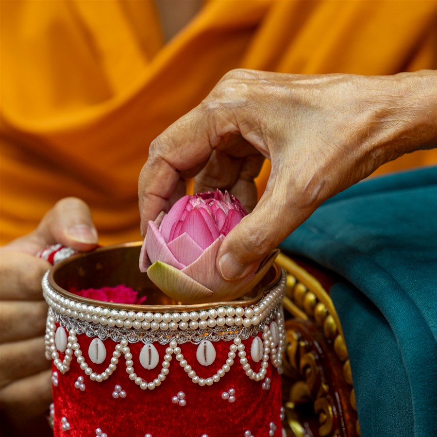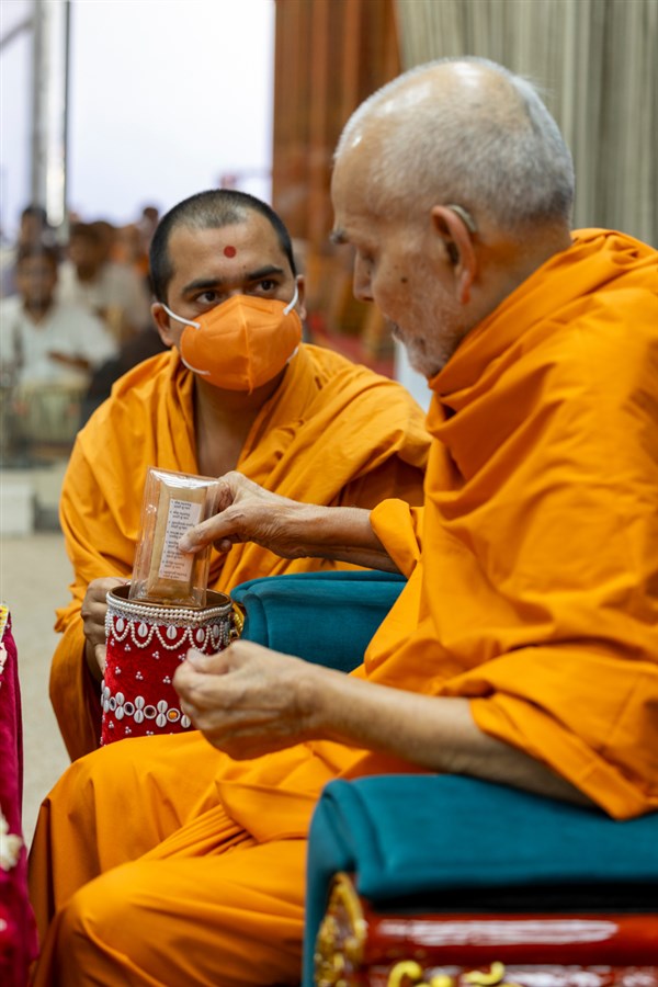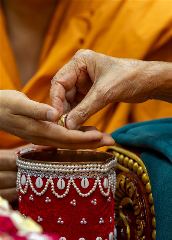 Swamishri sanctifies water with the holy relics of Bhagwan Swaminarayan and the Guru Parampara