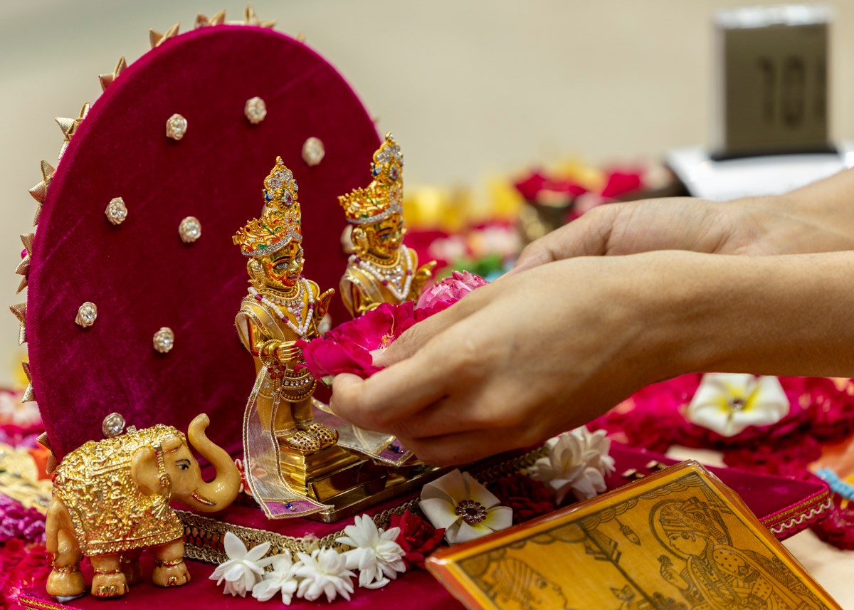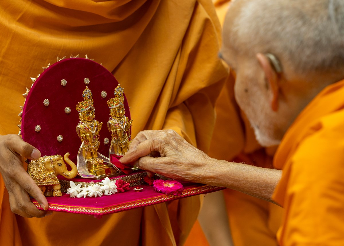 Swamishri places a flower at the feet of Shri Harikrishna Maharaj and Shri Gunatitanand Swami Maharaj