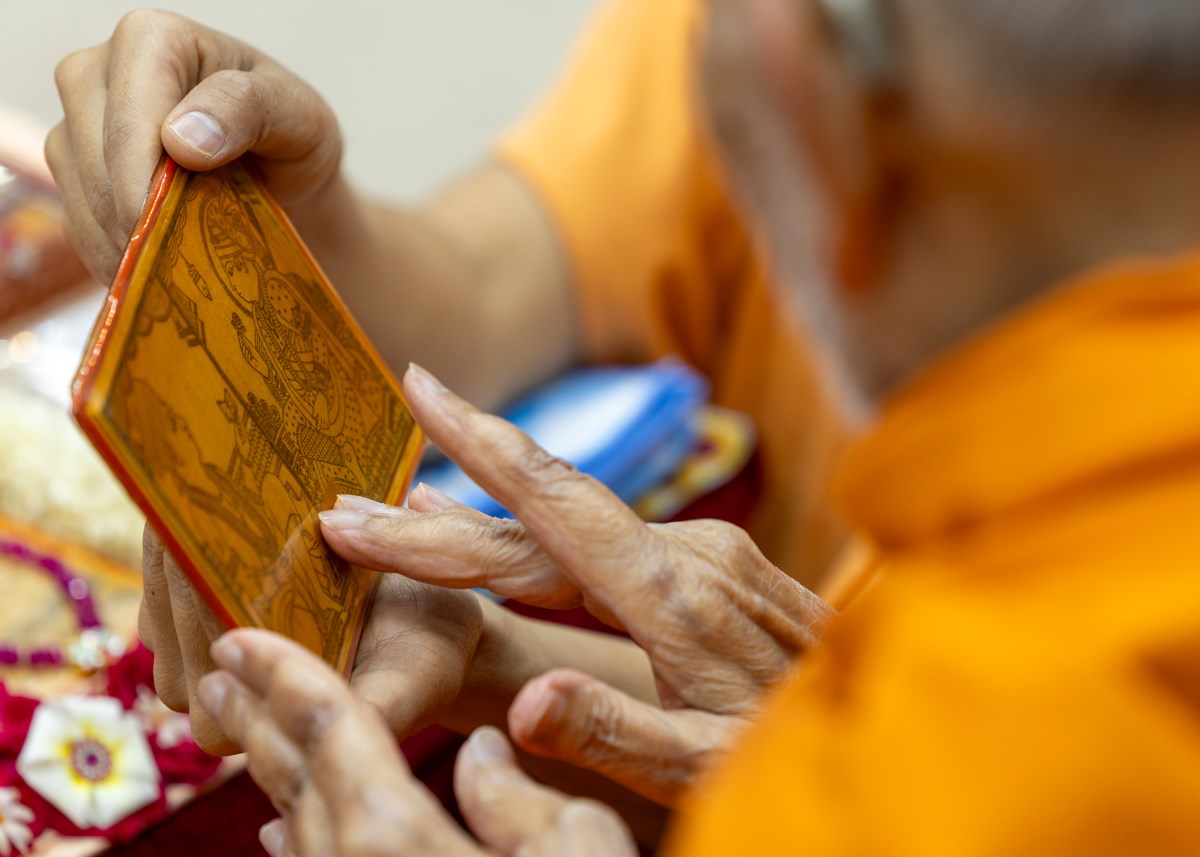 Swamishri touches his eyes after reverently touching the holy charanarvind of Shri Akshar-Purushottam Maharaj