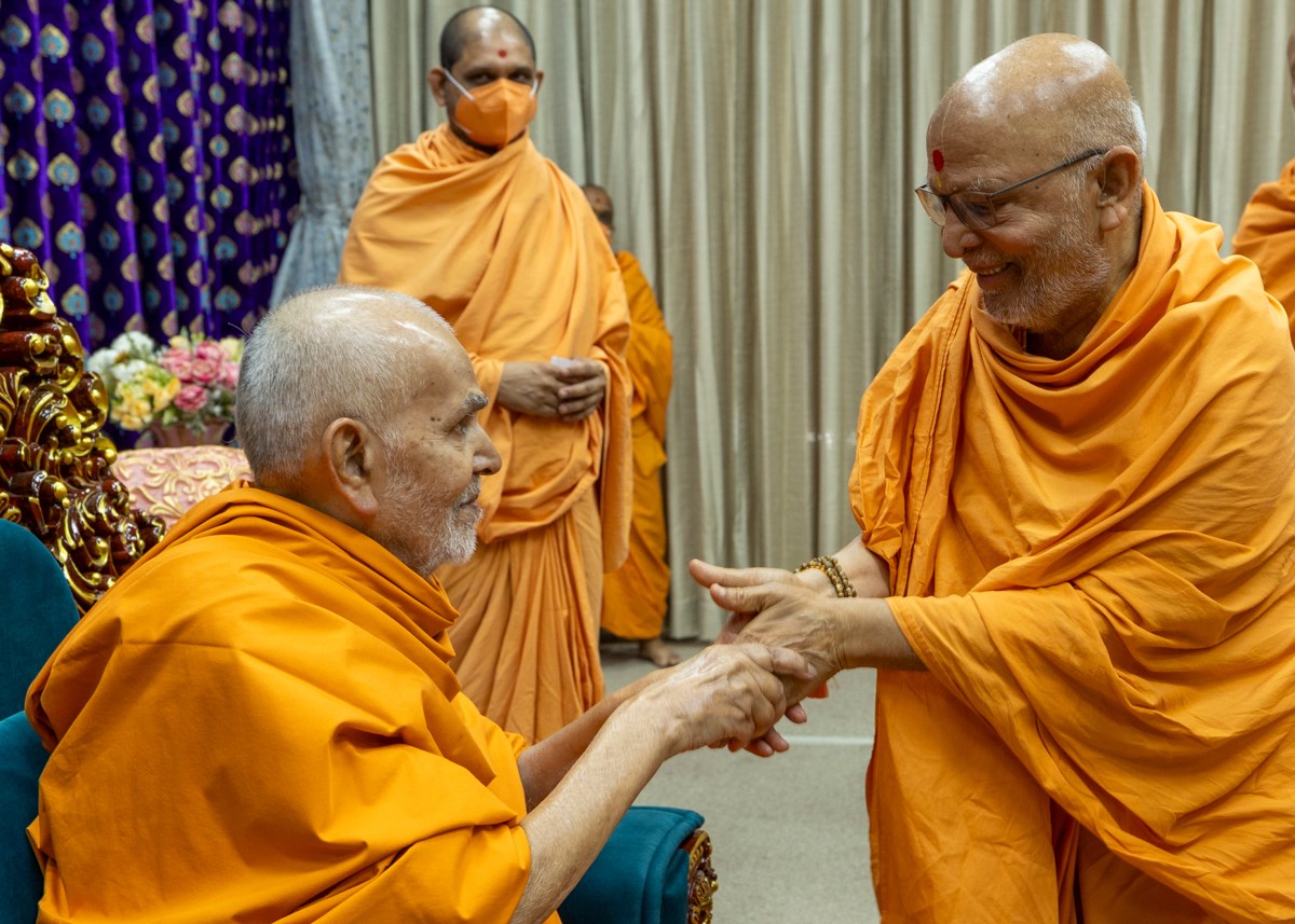 Pujya Ghanshyamcharan Swami greets Swamishri