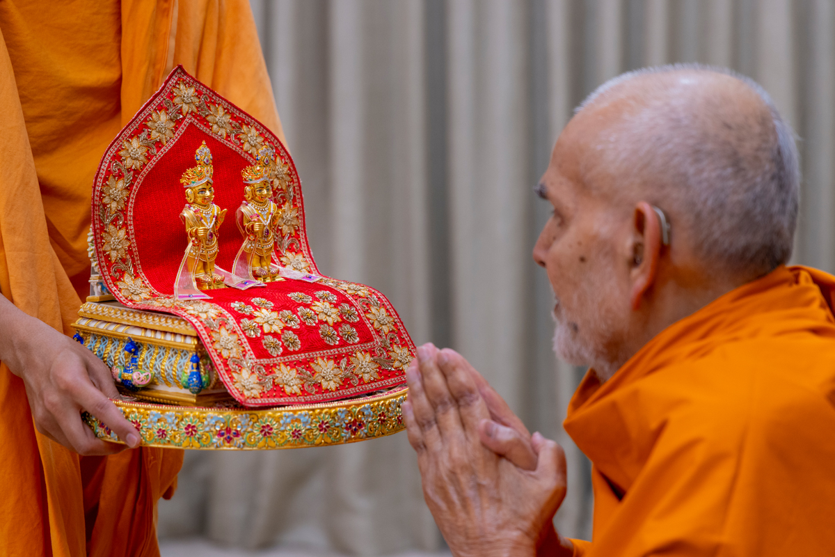 Swamishri engrossed in darshan of Shri Harikrishna Maharaj and Shri Gunatitanand Swami Maharaj