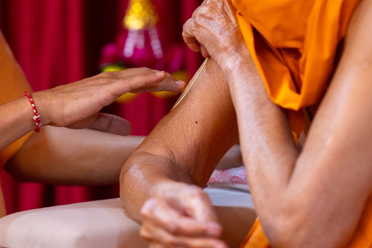 Swamishri applies a tilak on his upper arm