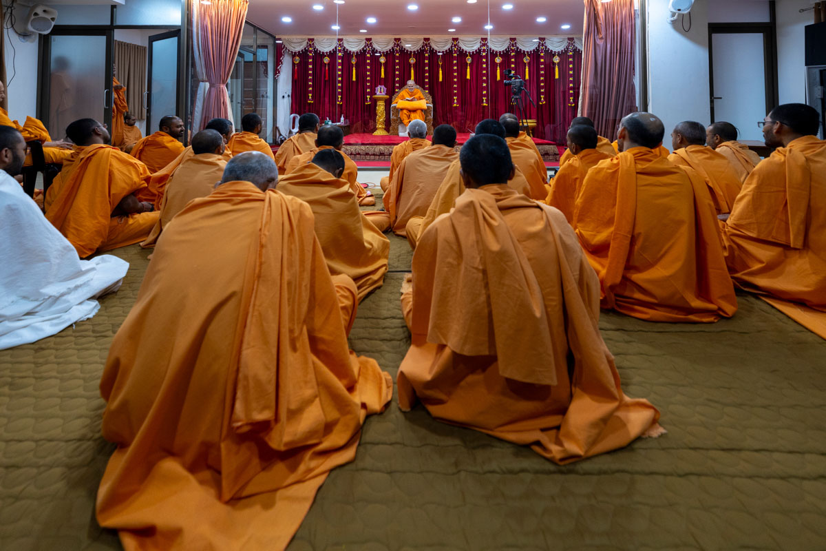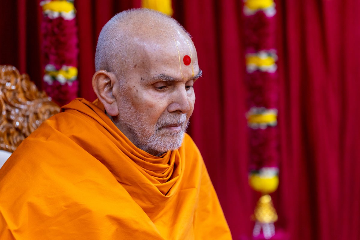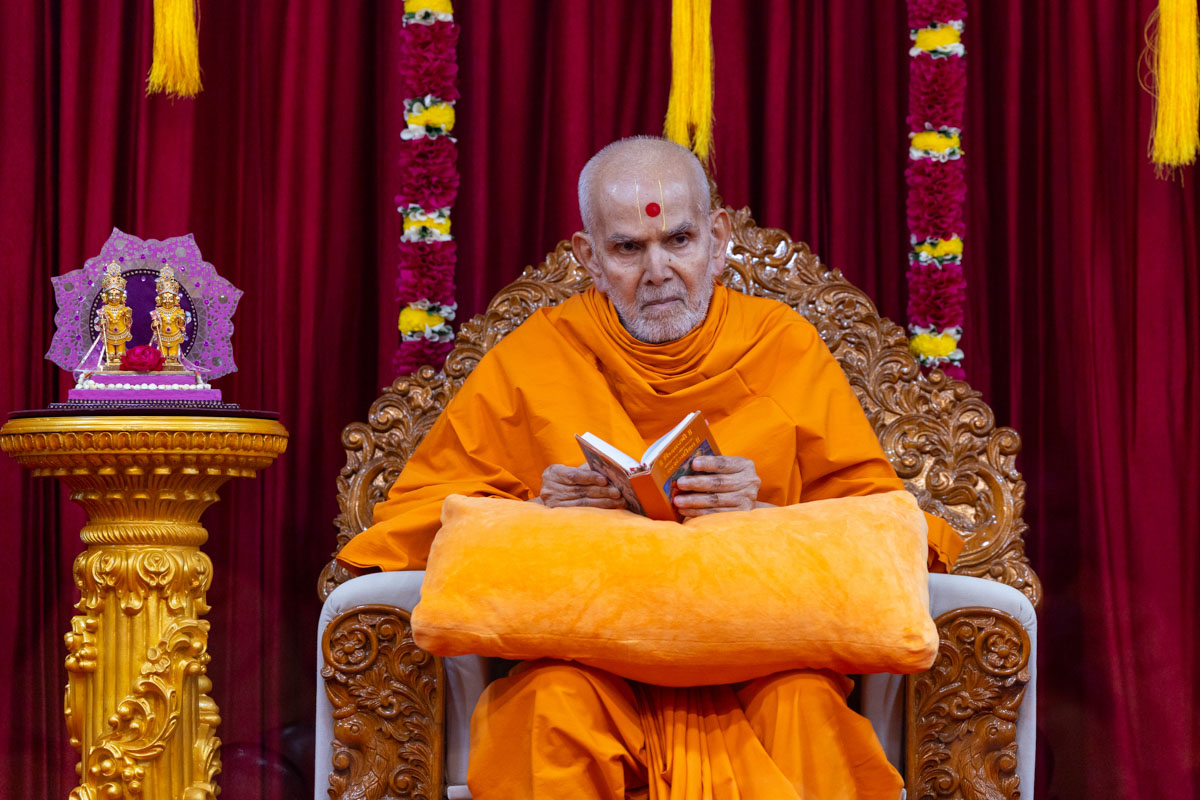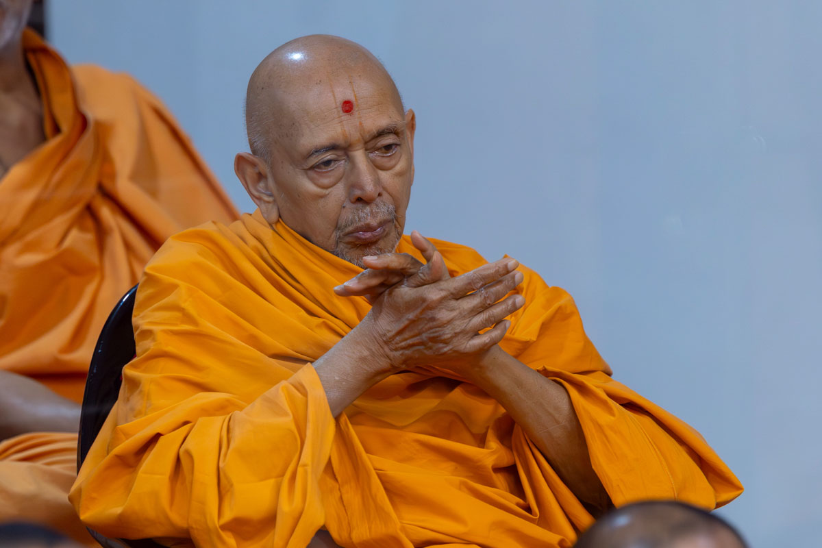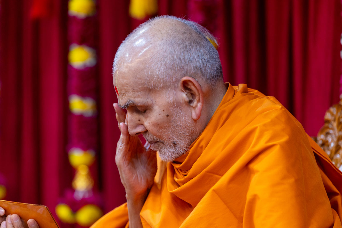 Swamishri listens to the sadhana mantra and daily prayer