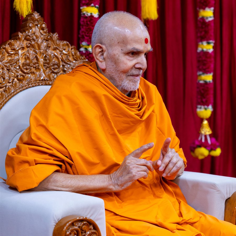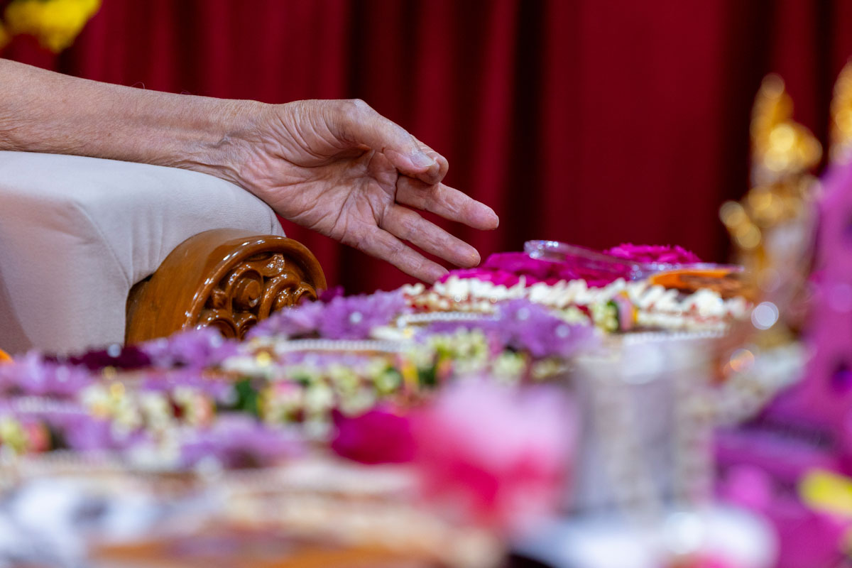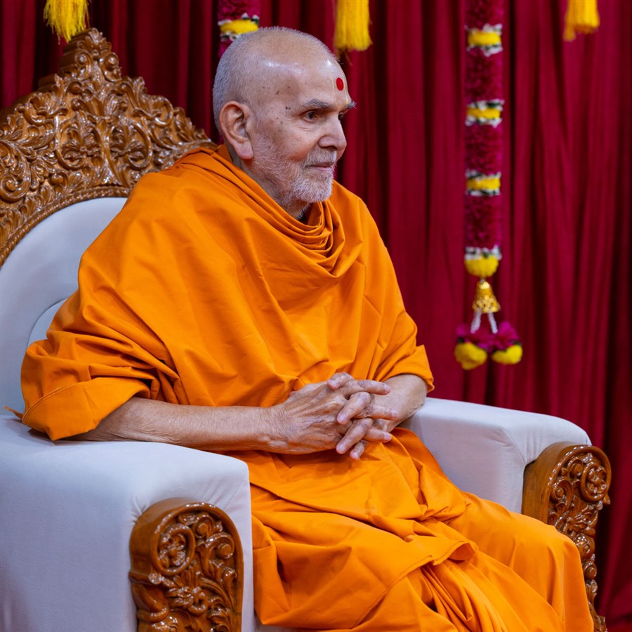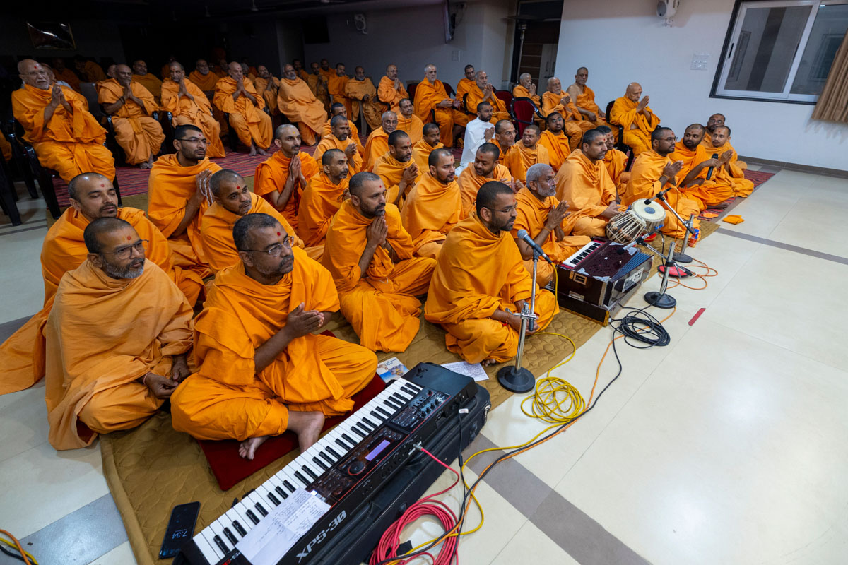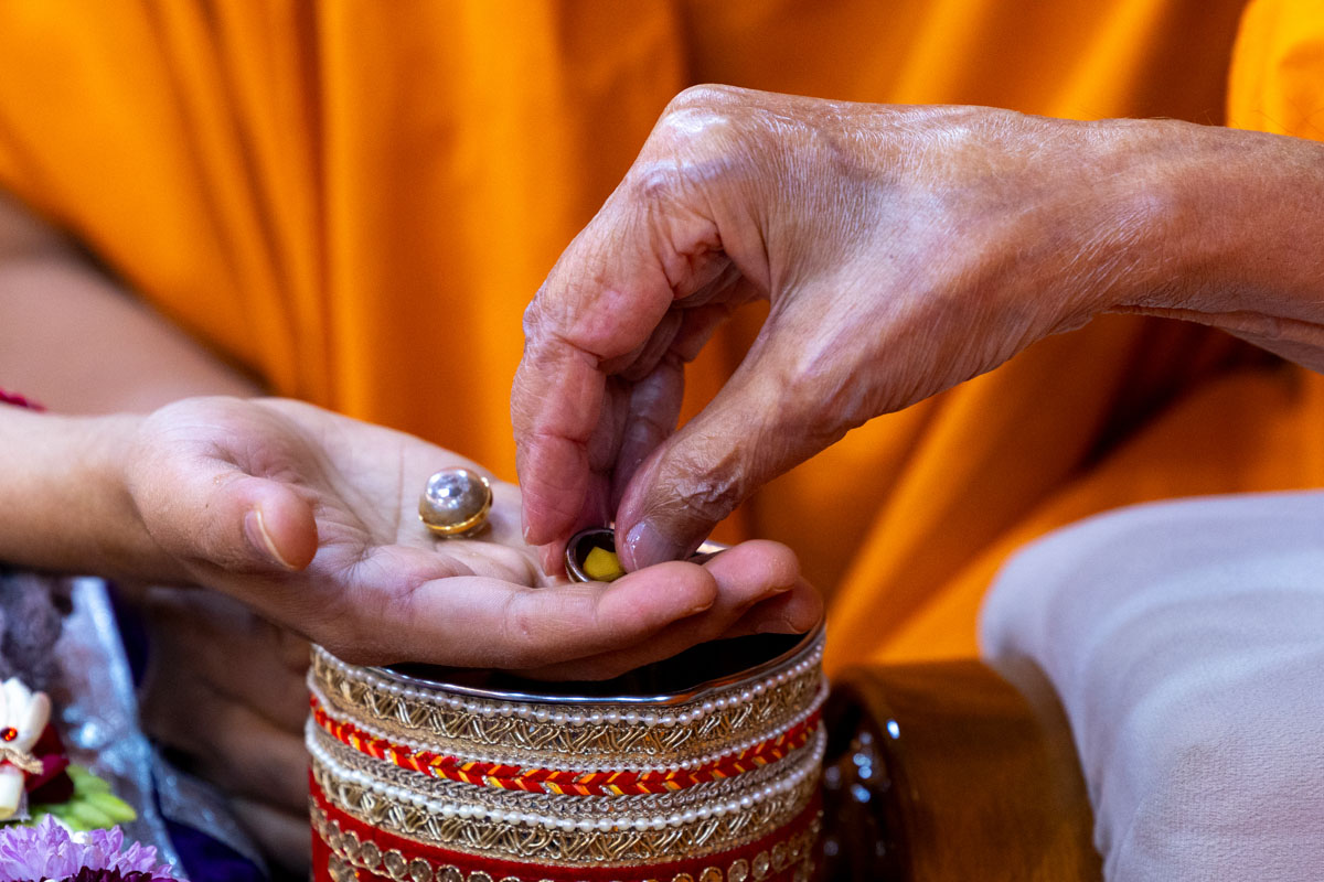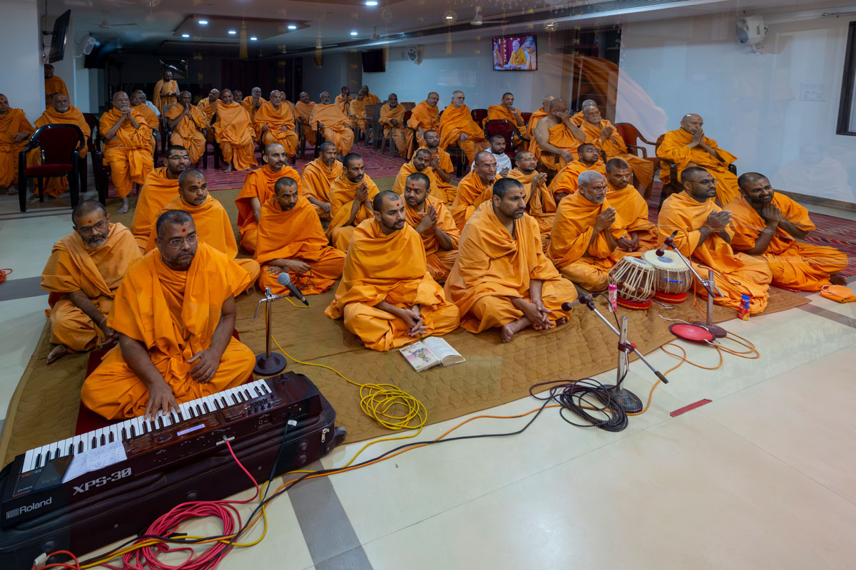 Swamishri listens to the sadhana mantra and daily prayer