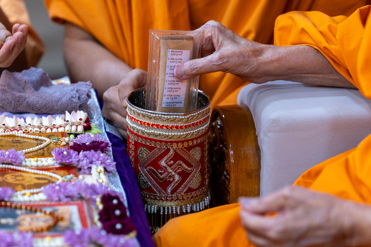 Swamishri sanctifies water with the holy relics of Bhagwan Swaminarayan and the Guru Parampara