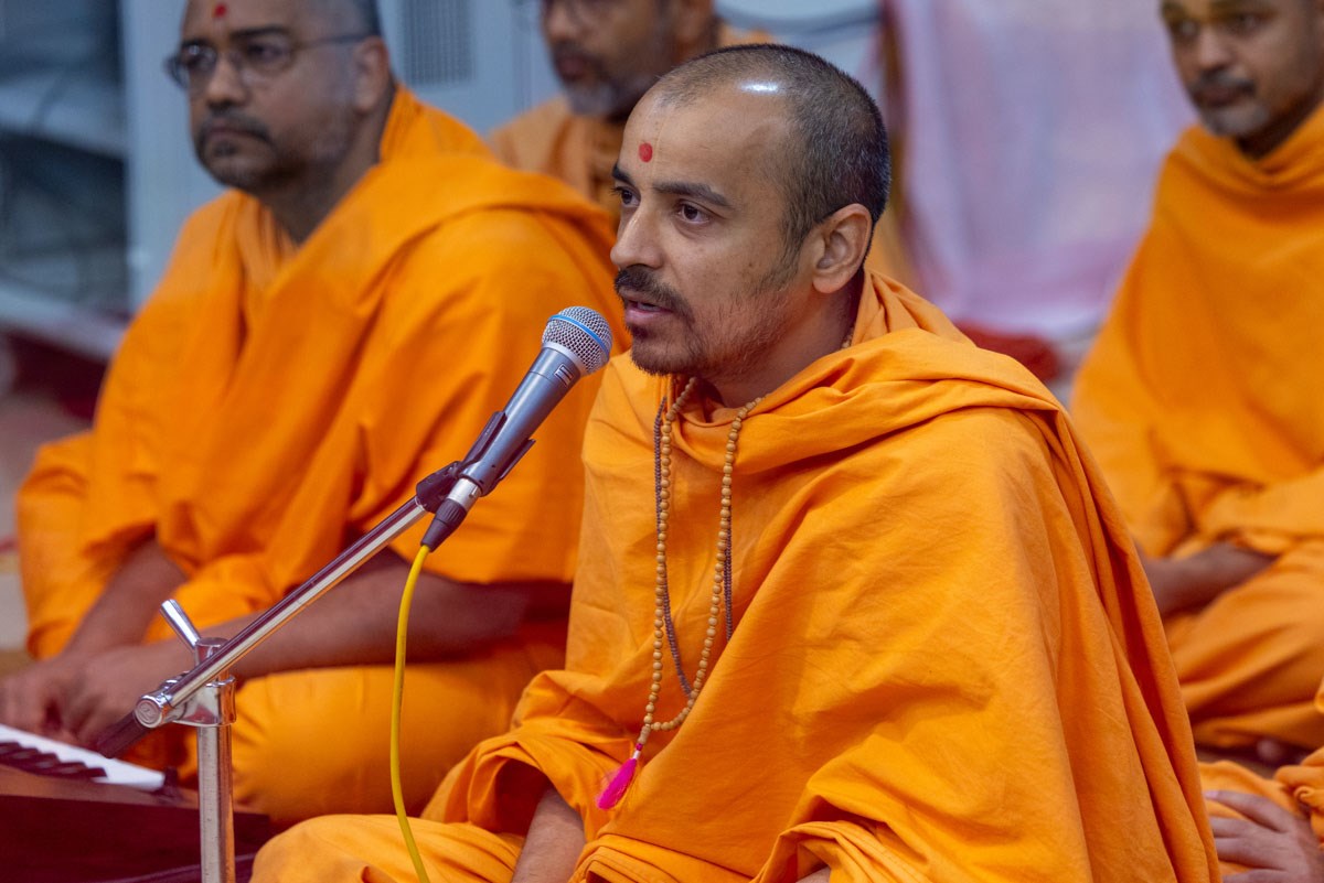 Hariprakash Swami leads everyone in reciting the sadhana mantra and daily prayer in Swamishri's puja