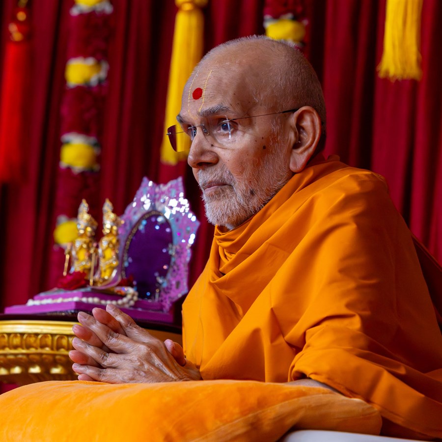 Swamishri engrossed in darshan of Shri Harikrishna Maharaj and Shri Lakshmi-Narayan Bhagwan