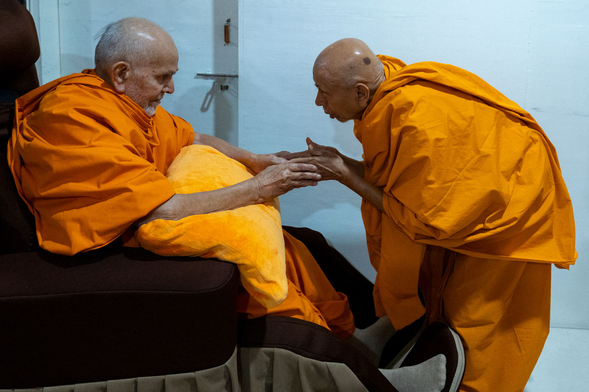Pujya Tyagvallabh Swami greets Swamishri