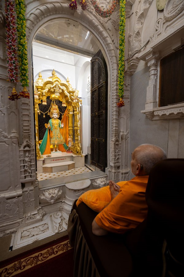 Swamishri engrossed in darshan of Shri Ghanshyam Maharaj