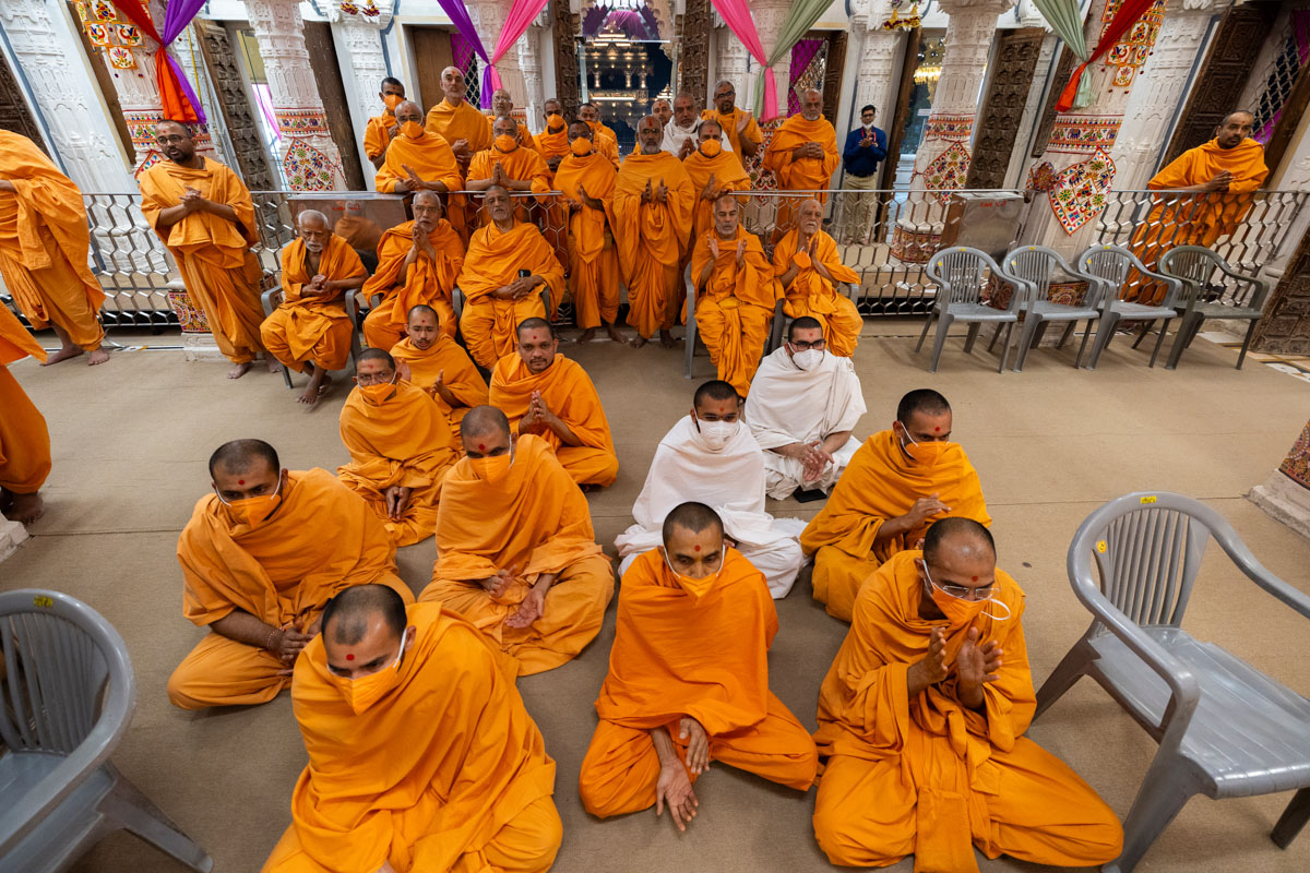 Swamis and devotees doing darshan of Swamishri