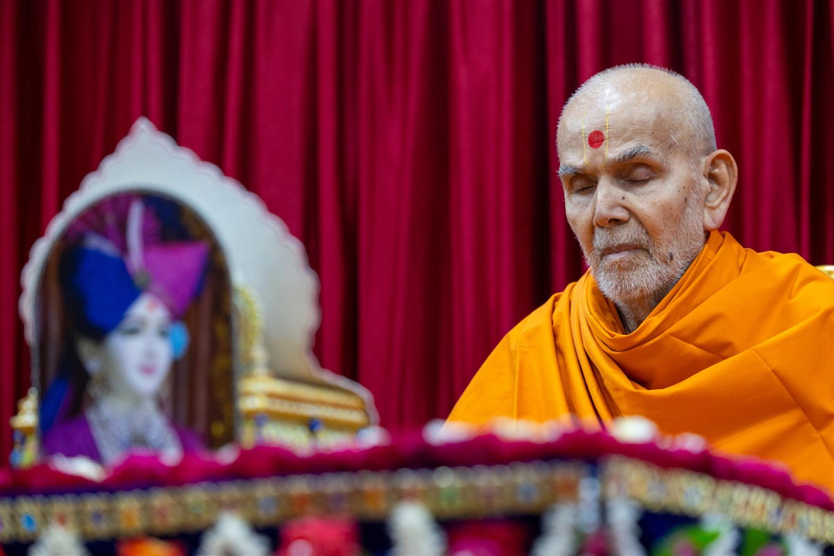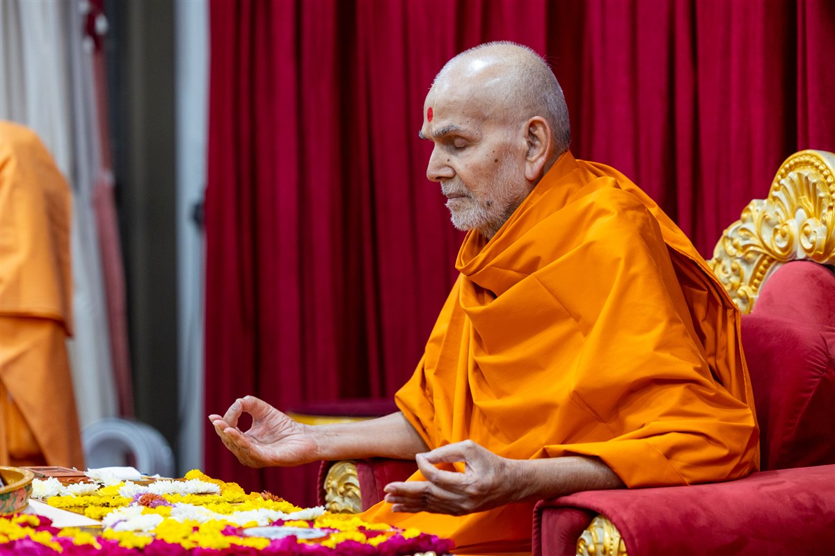 Param Pujya Mahant Swami Maharaj meditates in his daily puja