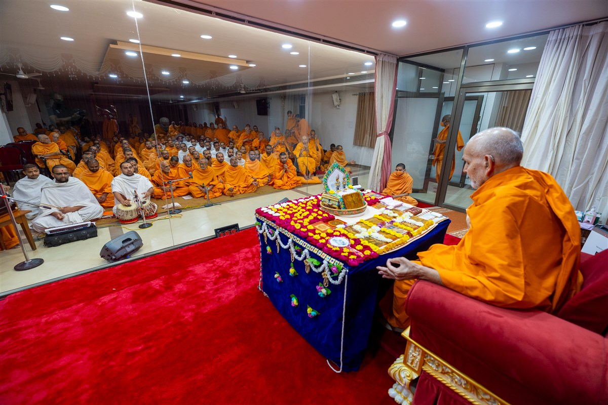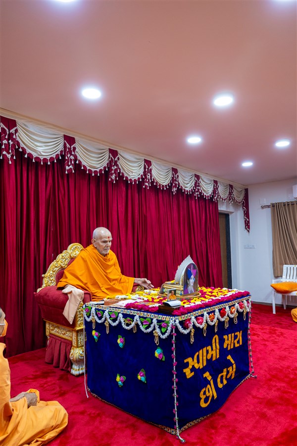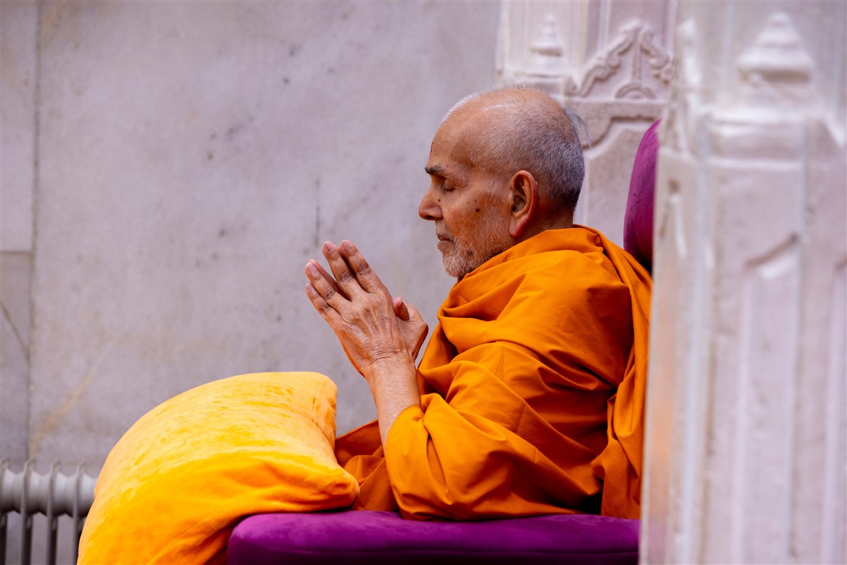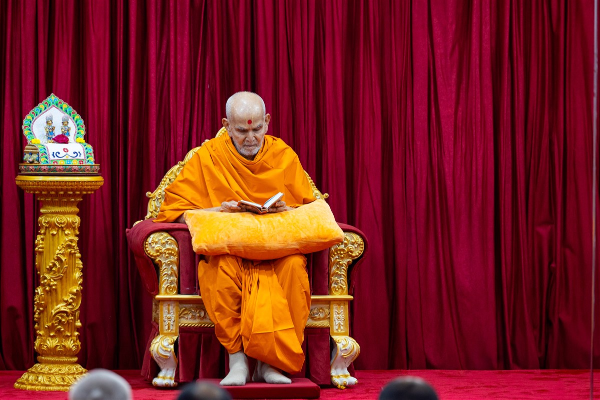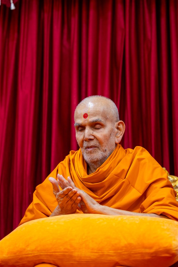 Swamishri listens to the sadhana mantra and daily prayer