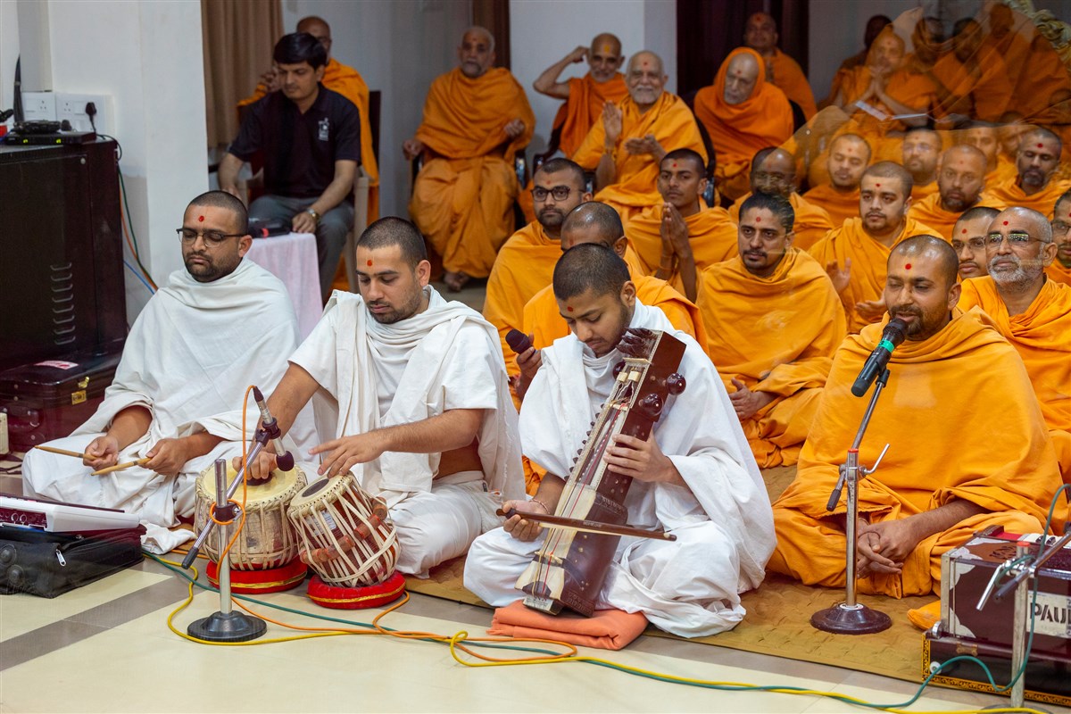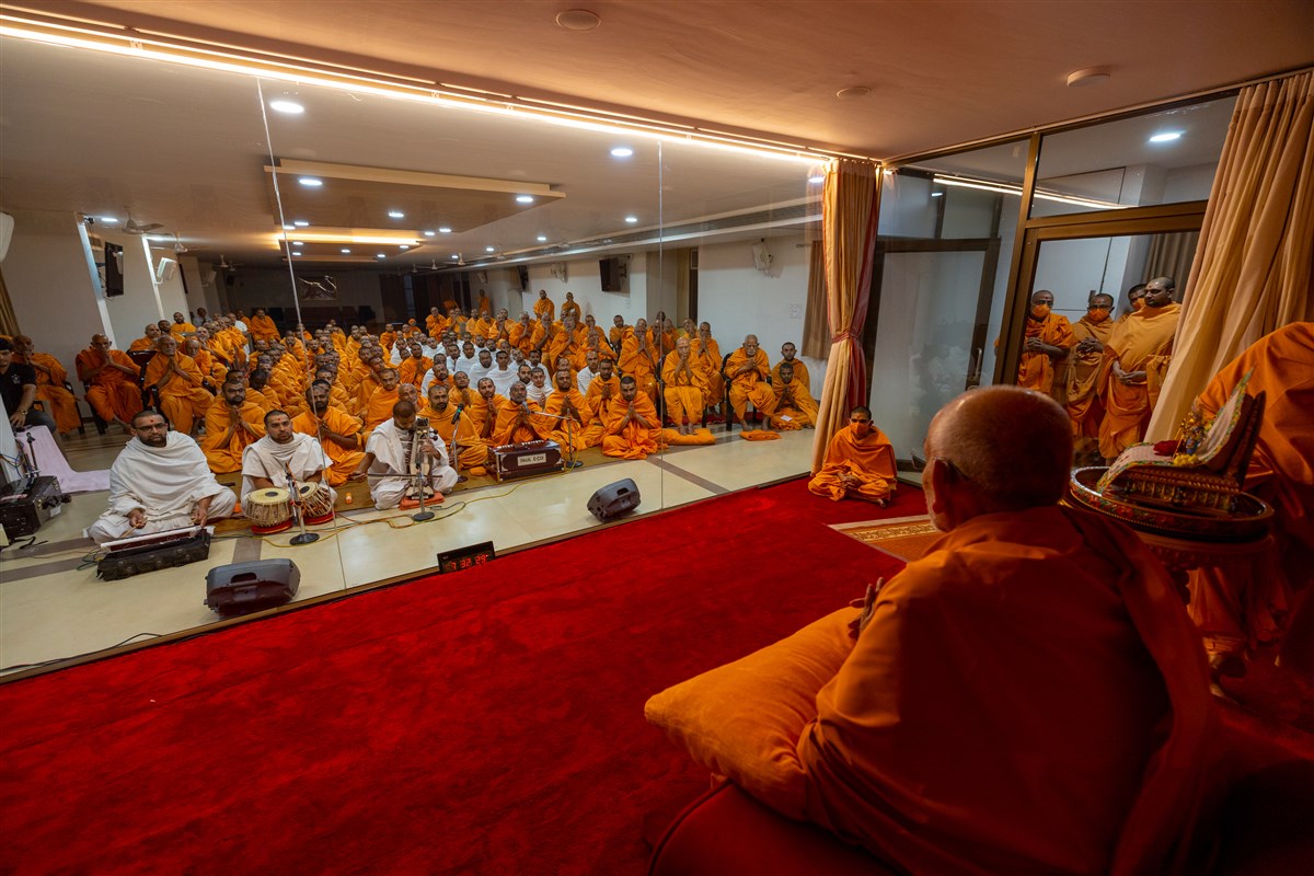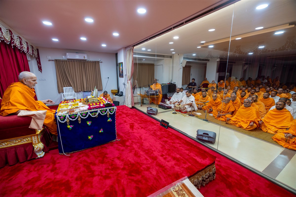 Swamis chant the Swaminarayan dhun in Swamishri's daily puja