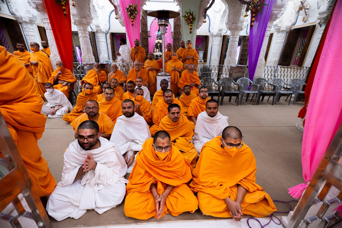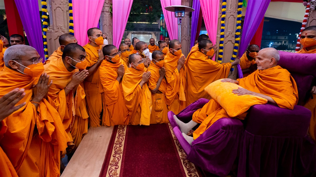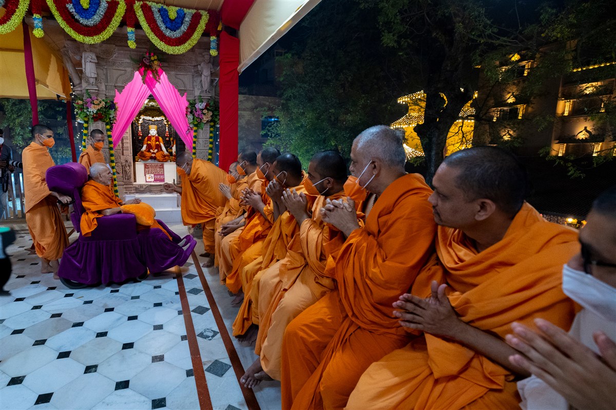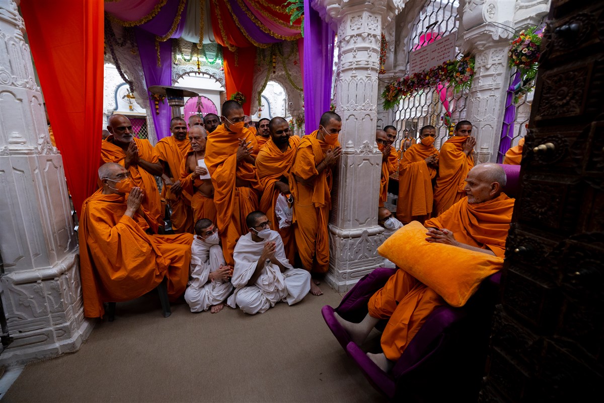 Swamis and parshads doing darshan of Swamishri