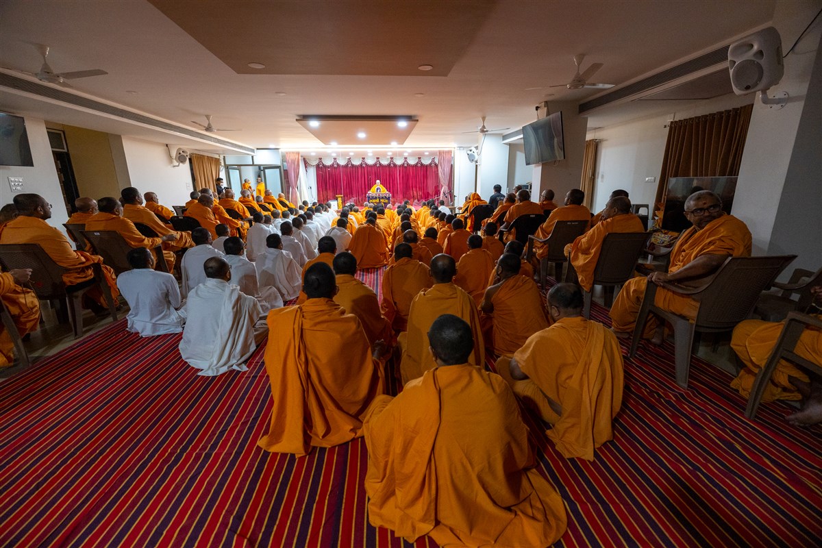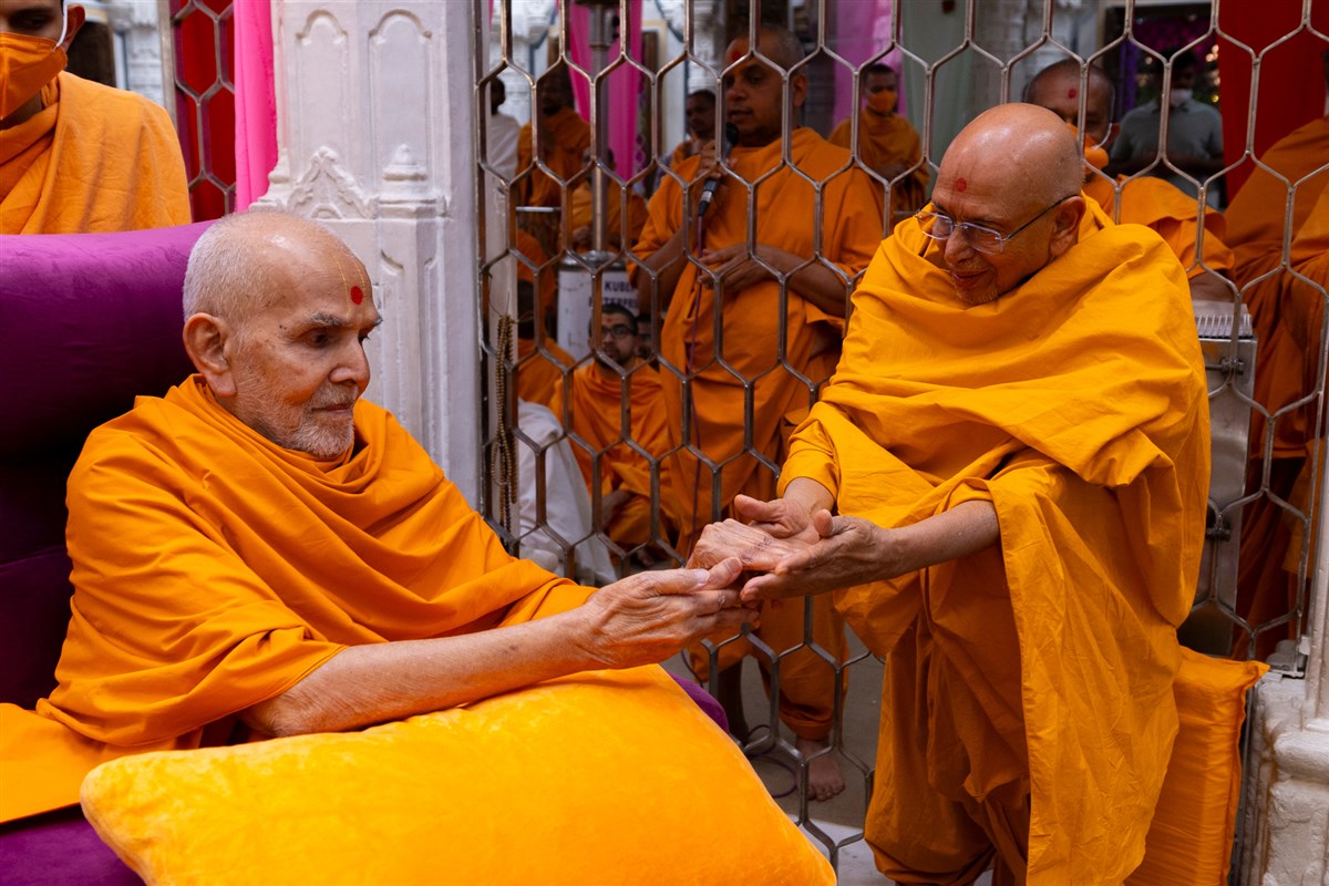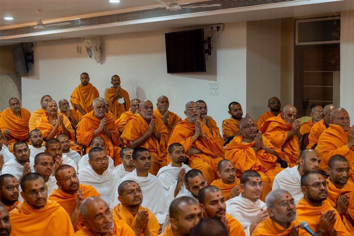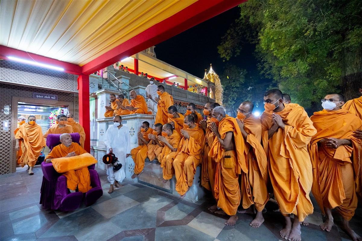 Swamis and parshads doing darshan of Swamishri