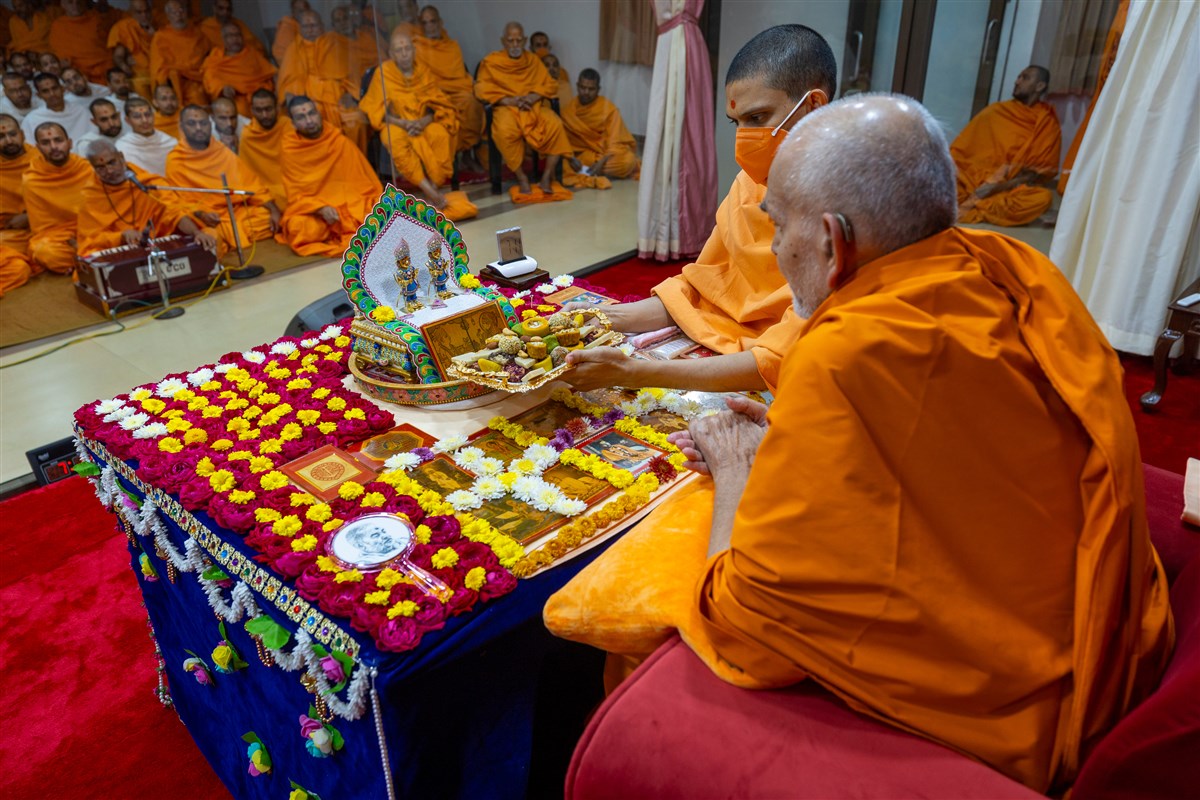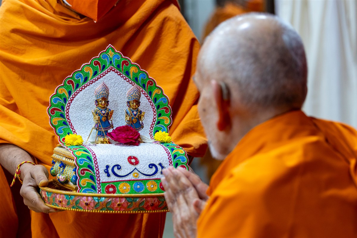 Swamishri offers thal to Shri Harikrishna Maharaj and Shri Gunatitanand Swami Maharaj