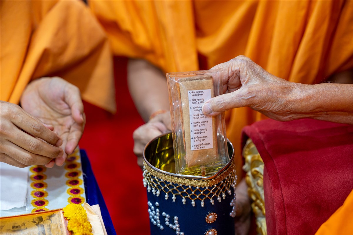 Swamishri sanctifies water with the holy relics of Bhagwan Swaminarayan and the Guru Parampara
