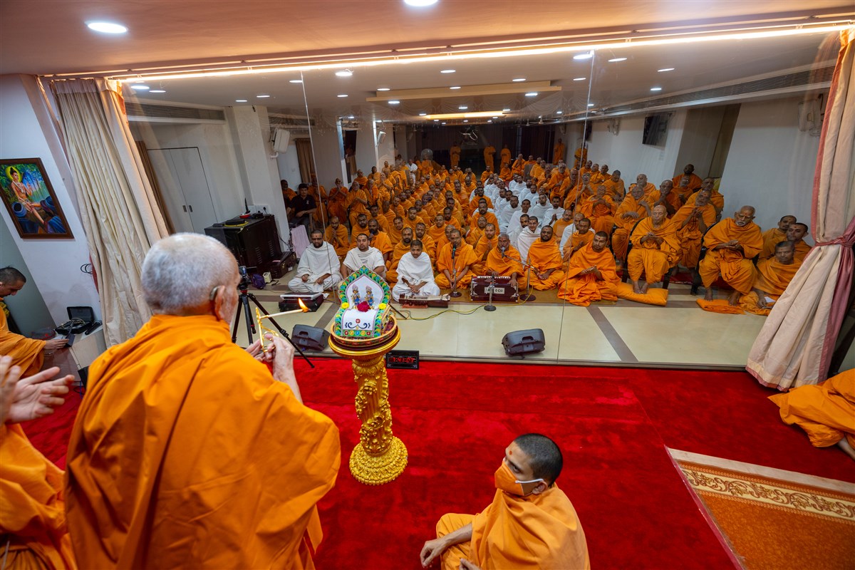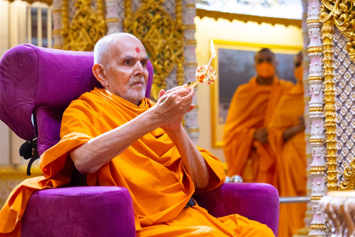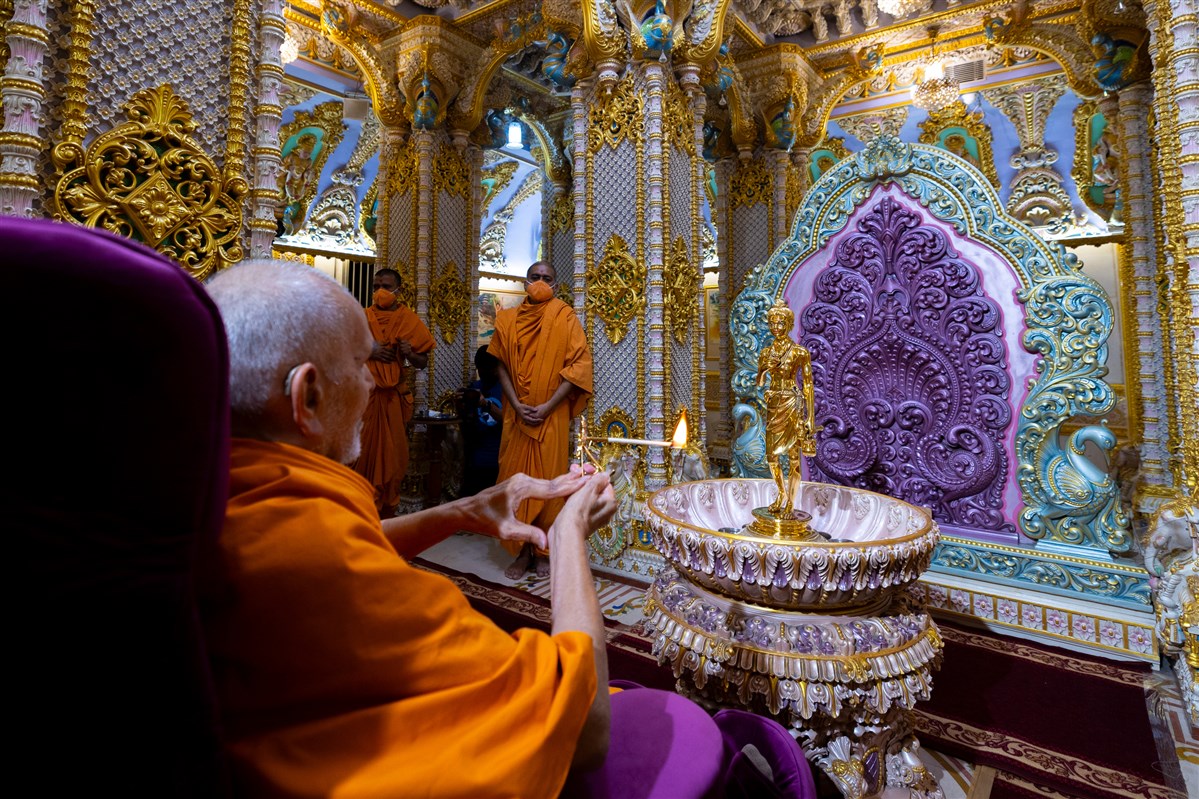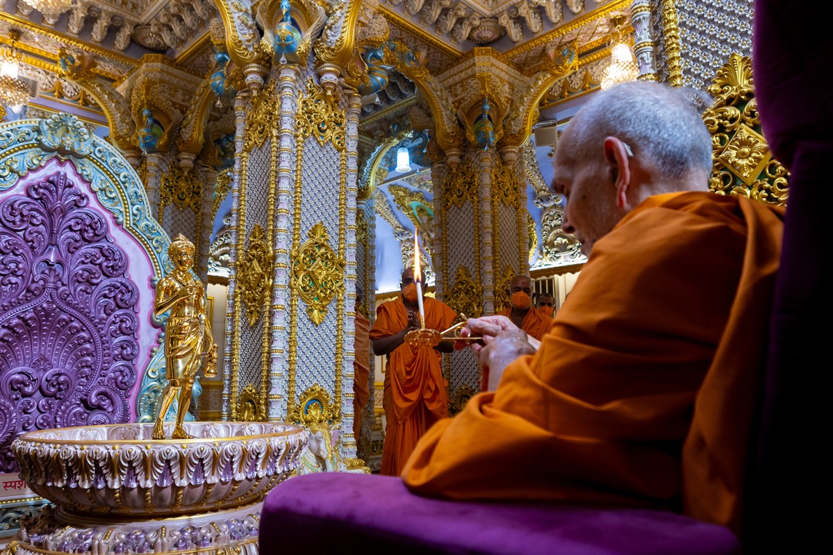 Swamishri performs the morning arti