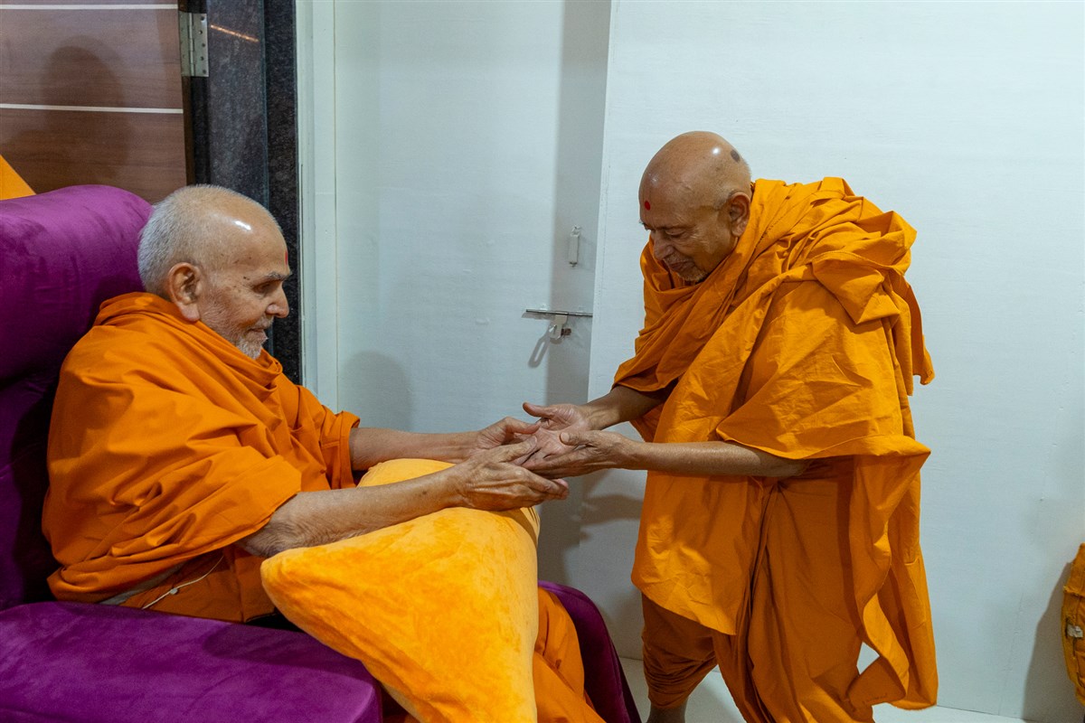 Pujya Tyagvallabh Swami greets Swamishri