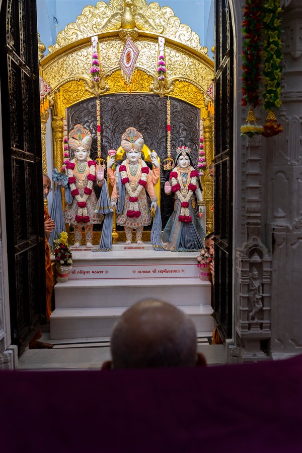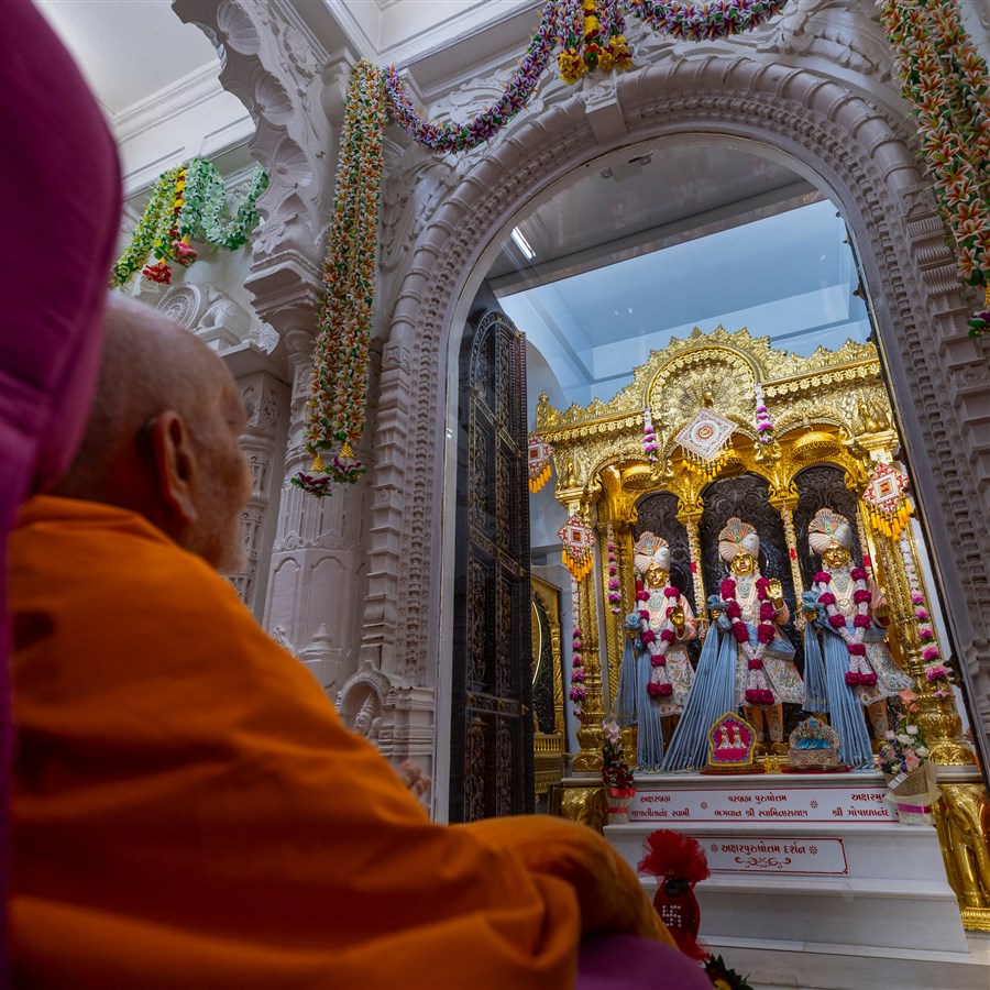 Swamishri engrossed in darshan of Shri Harikrishna Maharaj and Shri Lakshmi-Narayan Bhagwan