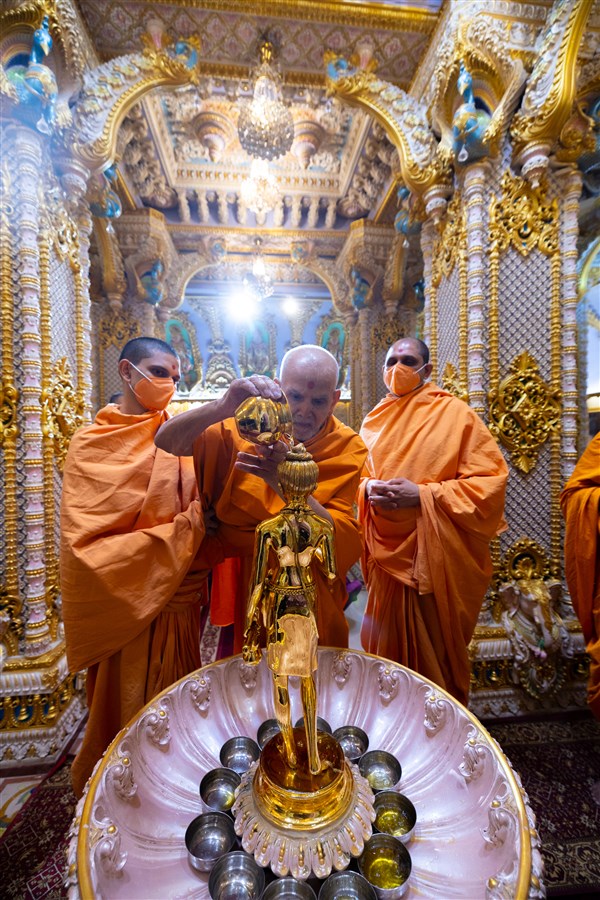 Swamishri performs abhishek of Shri Nilkanth Varni