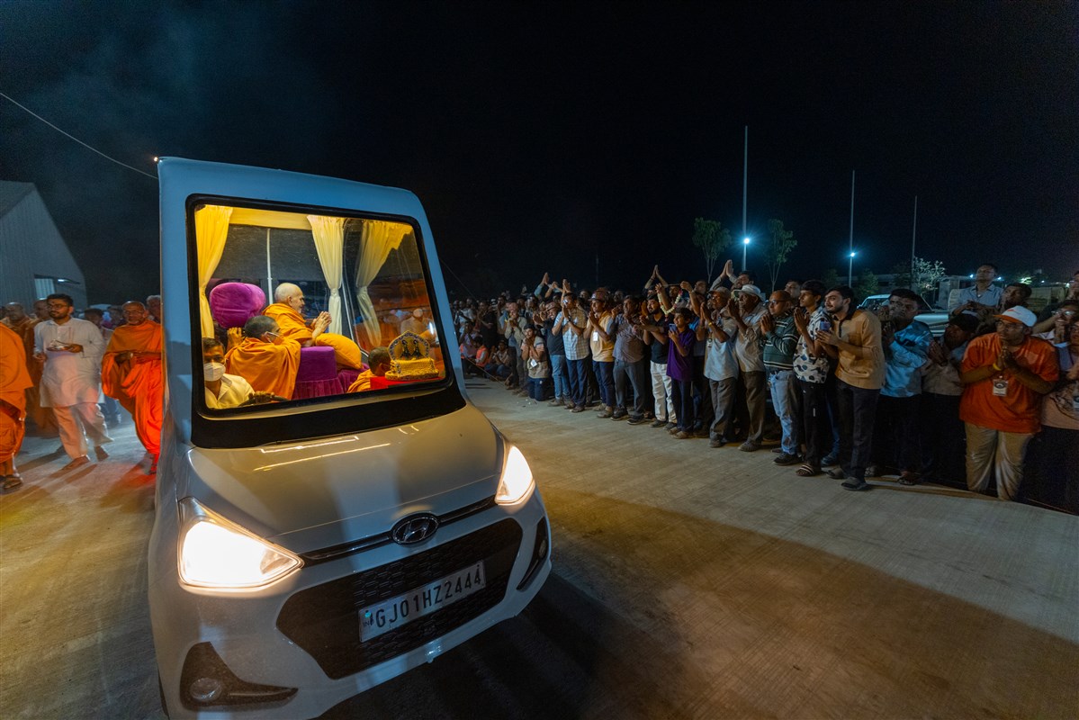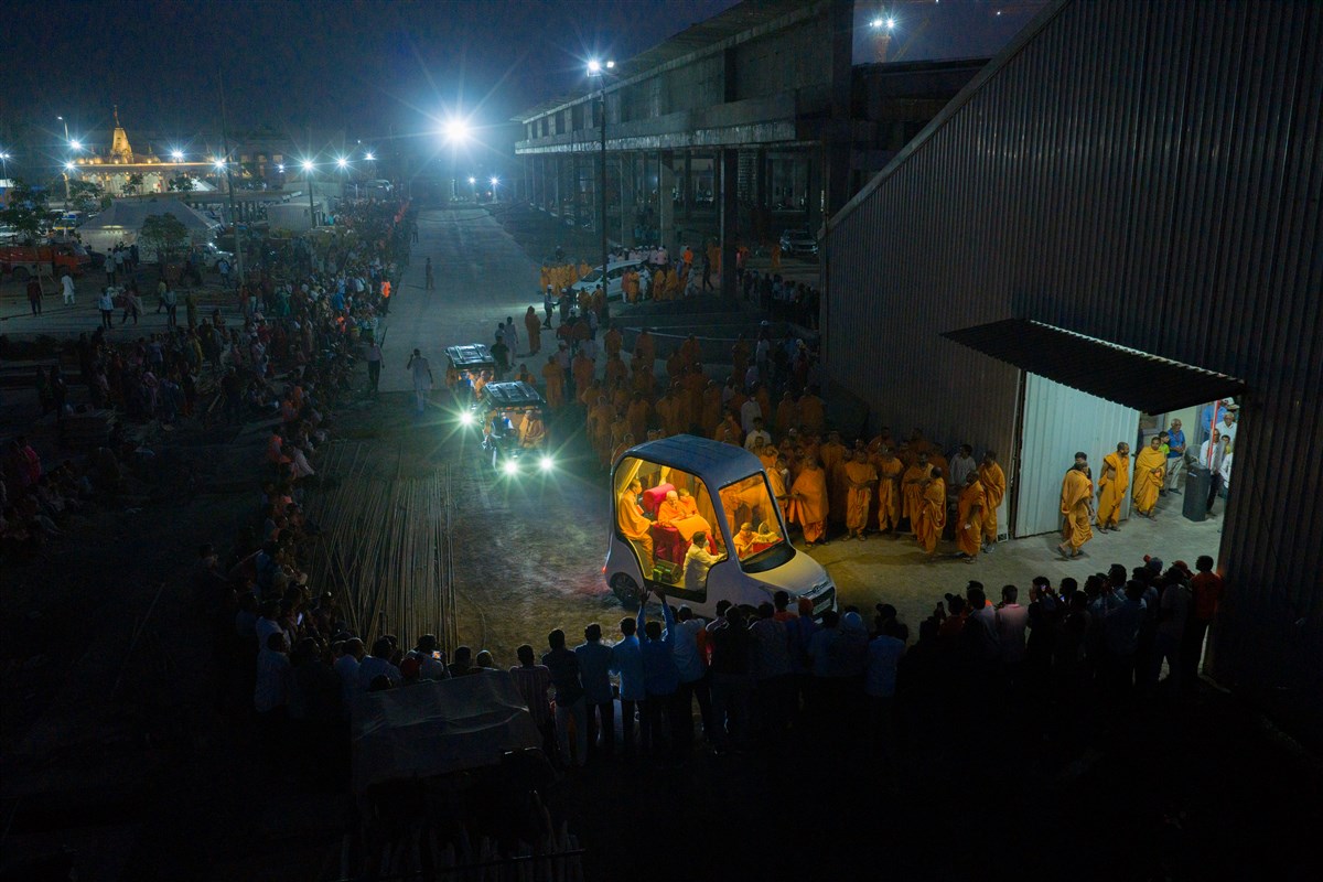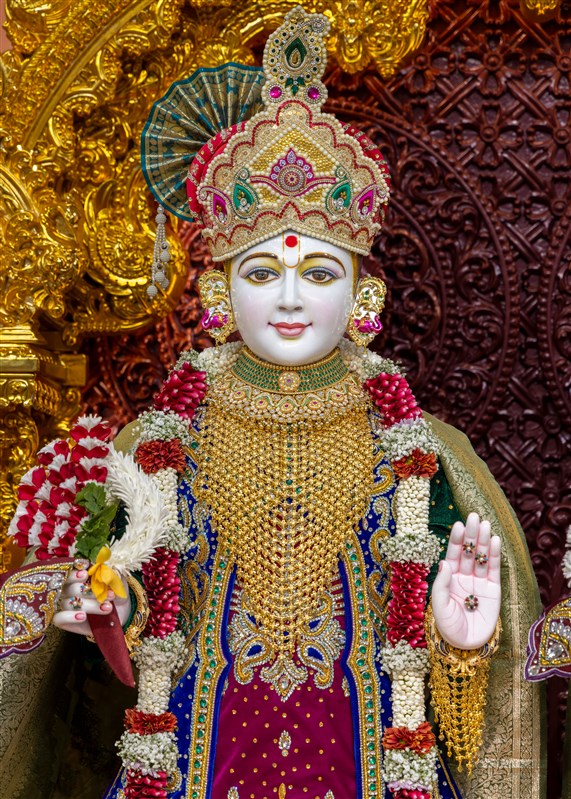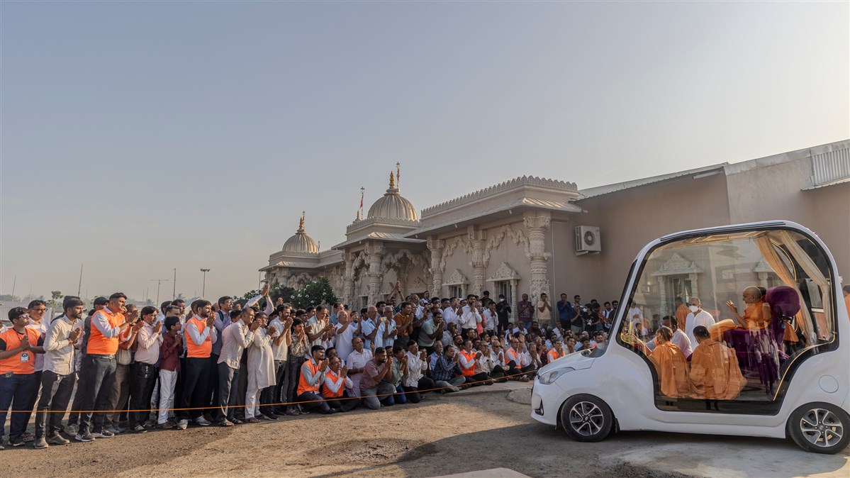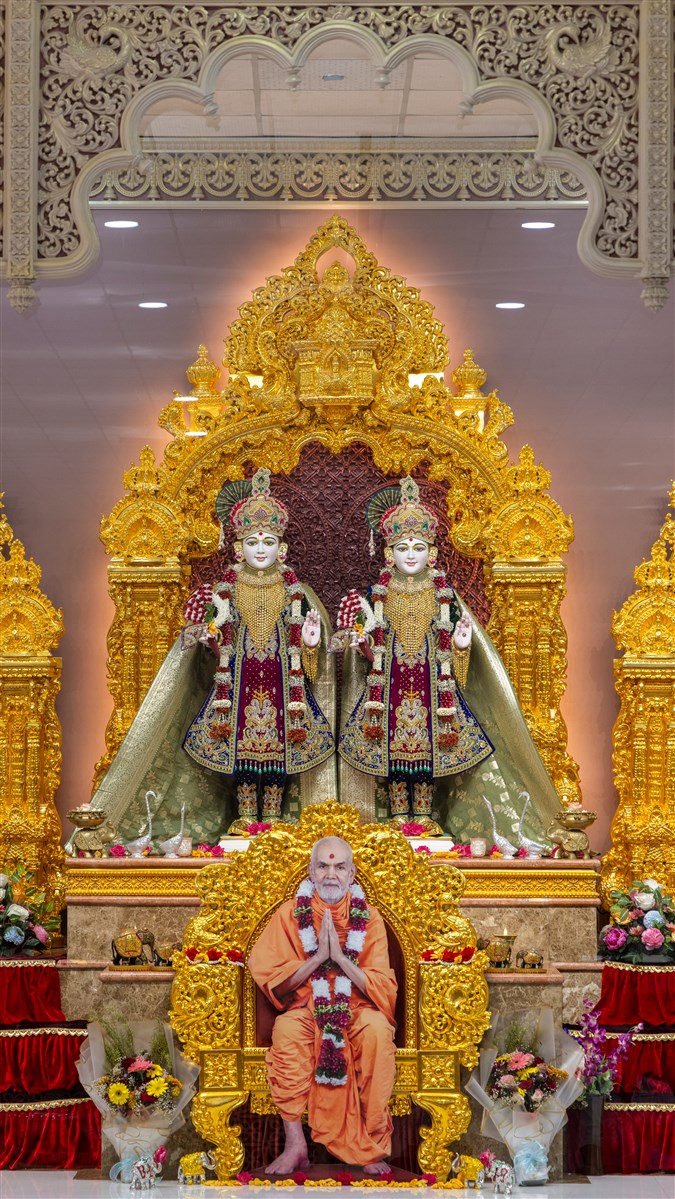 BAPS Shri Swaminarayan Prarthana Mandir, Kanad, Surat, Bhagwan Swaminarayan, Aksharbrahma Gunatitanand Swami Maharaj and Pragat Brahmaswarup Mahant Swami Maharaj