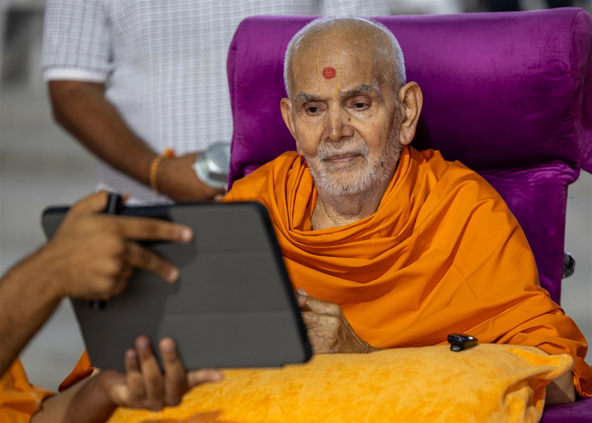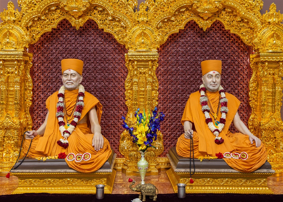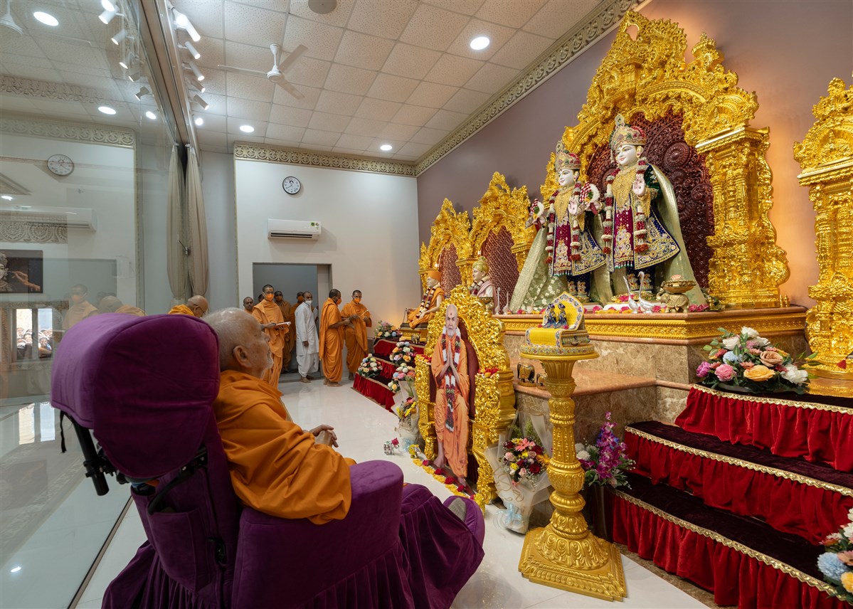 Swamishri engrossed in darshan of Shri Harikrishna Maharaj and Shri Gunatitanand Swami Maharaj
