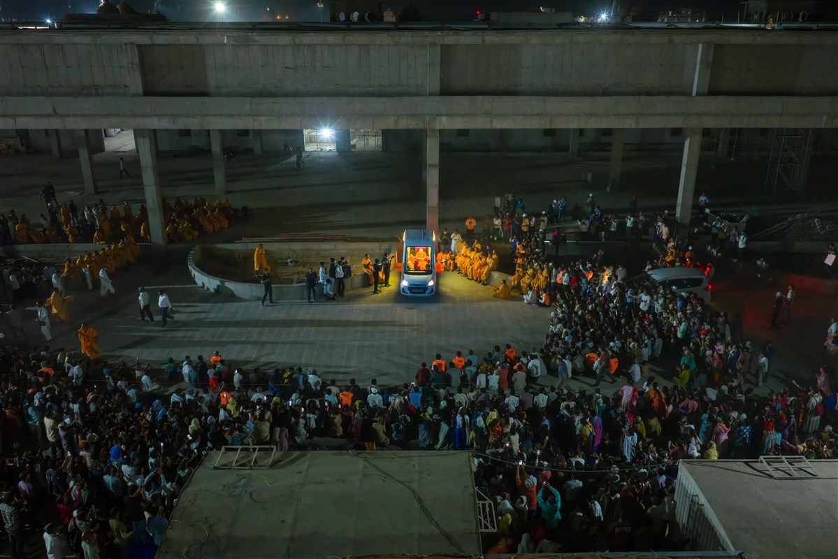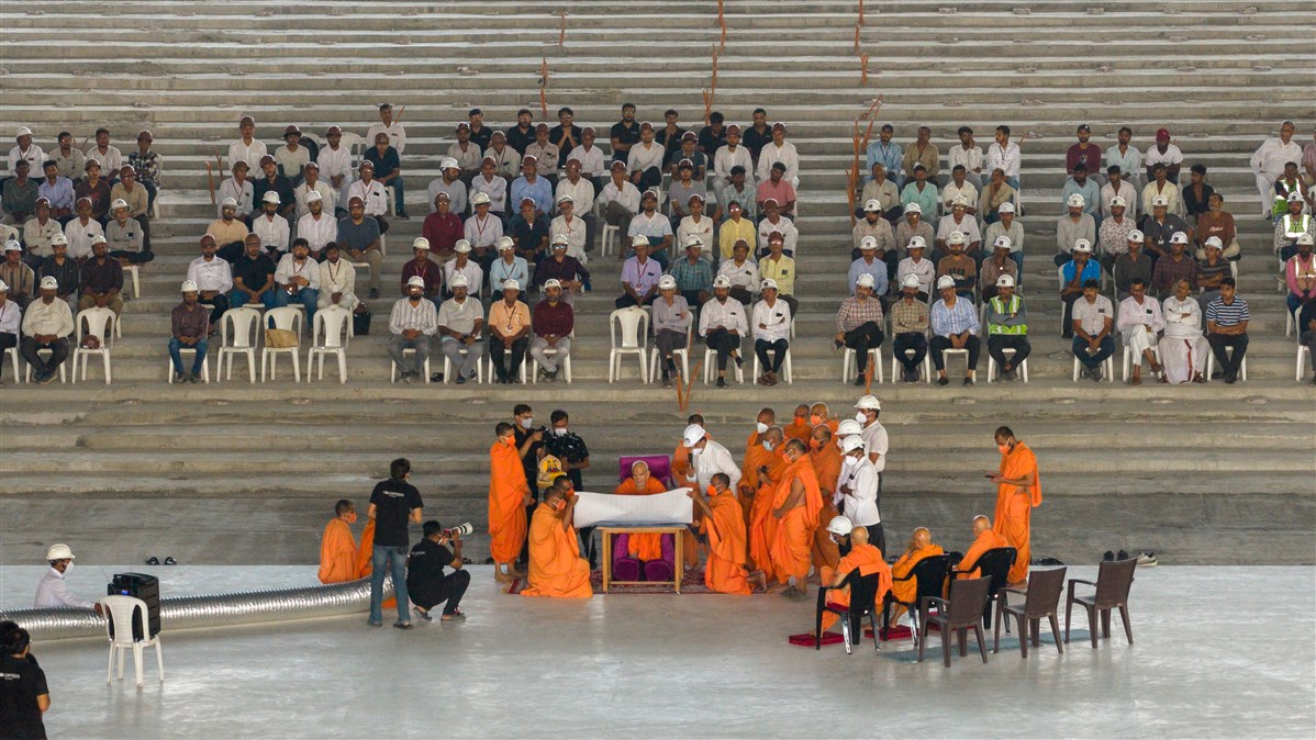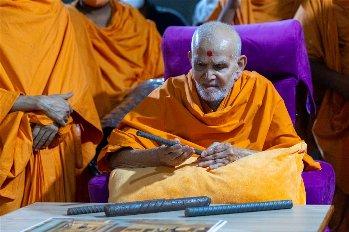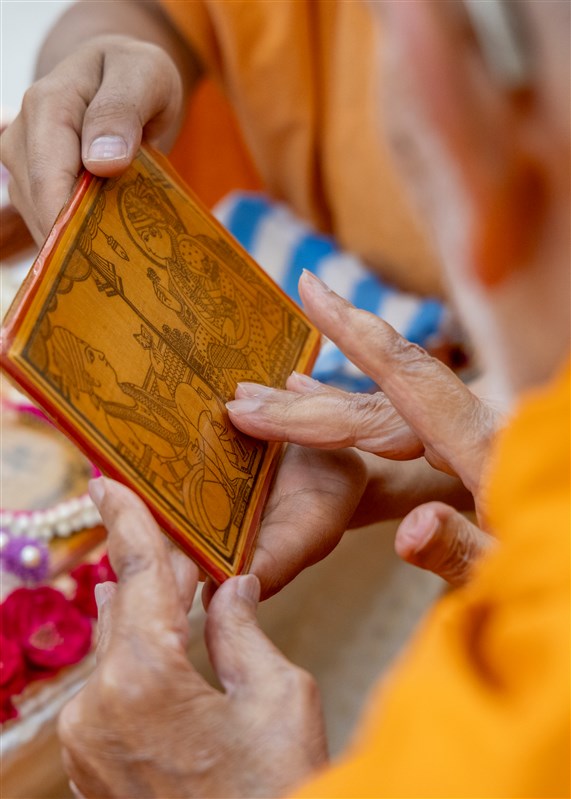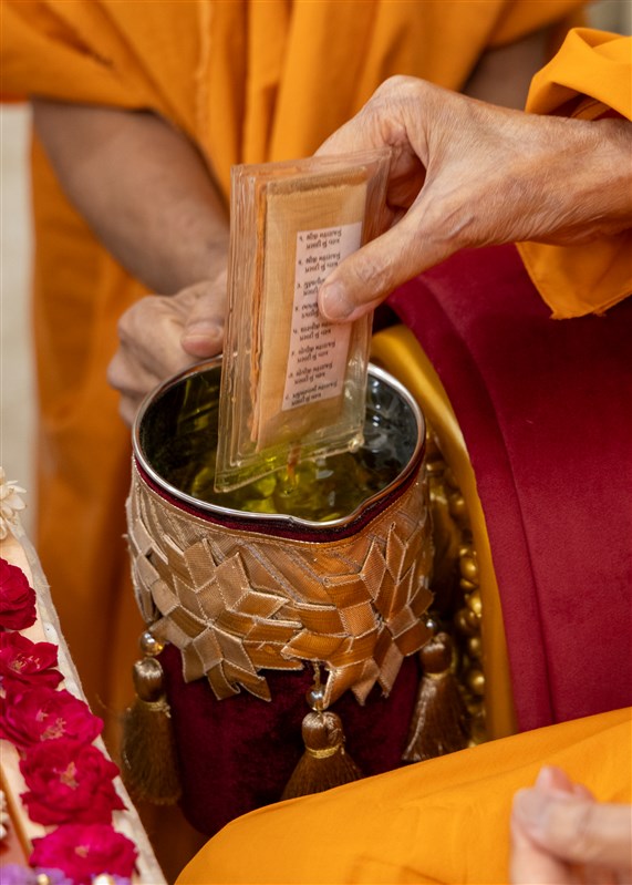 Swamishri sanctifies water with the holy relics of Bhagwan Swaminarayan and the Guru Parampara