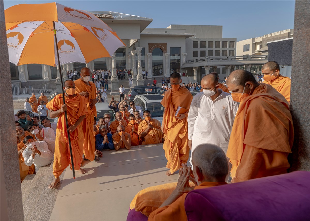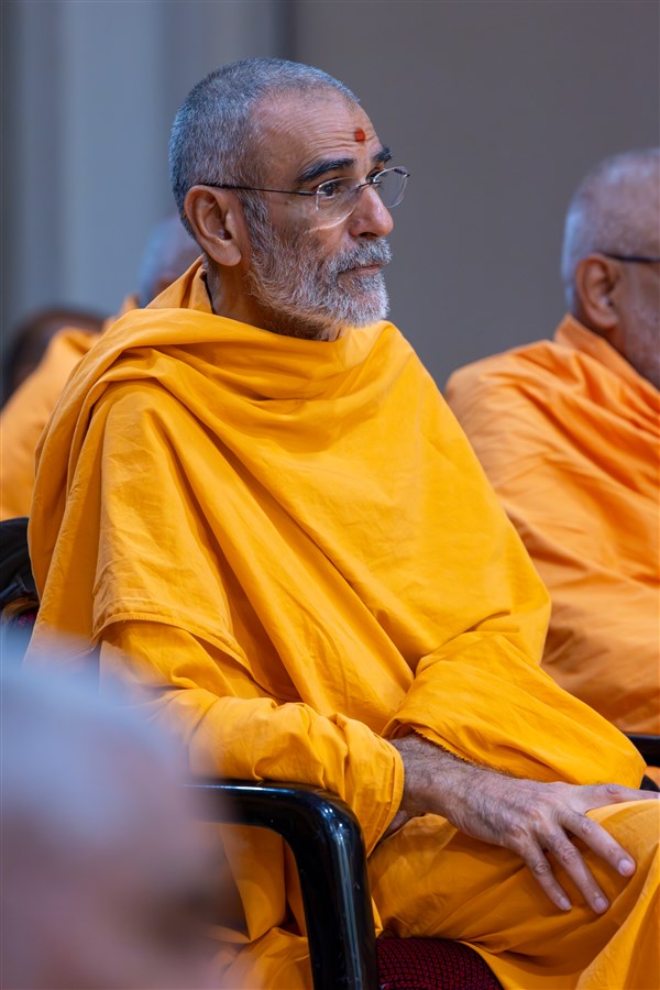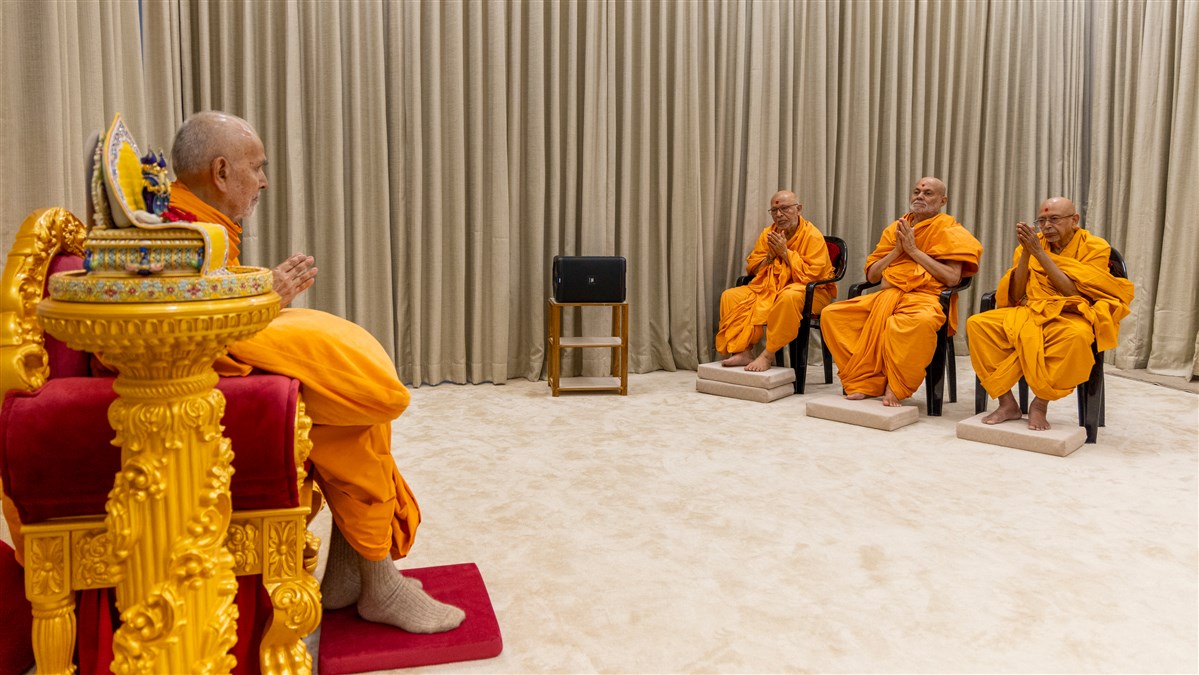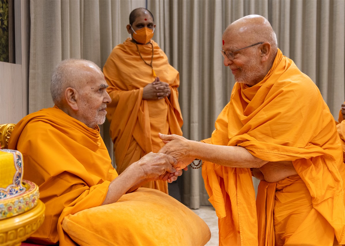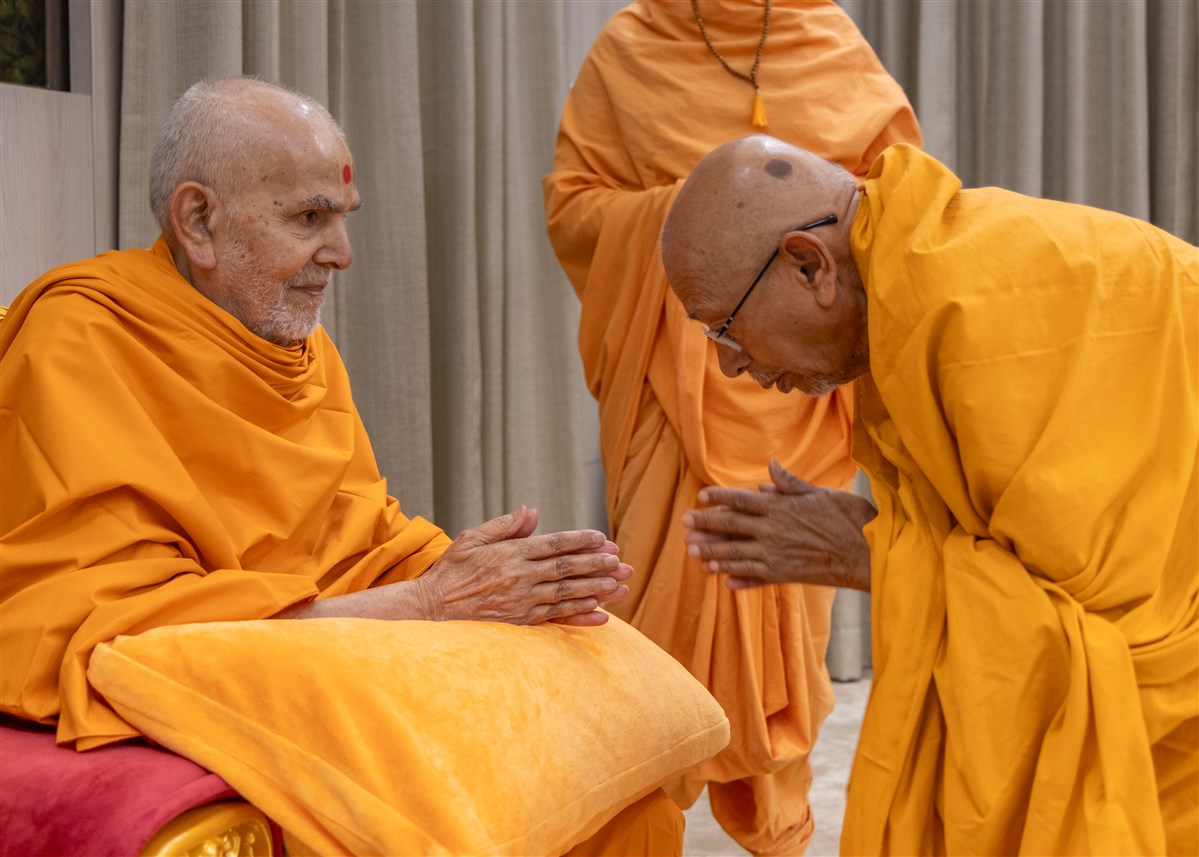 Pujya Ghanshyamcharan Swami greets Swamishri