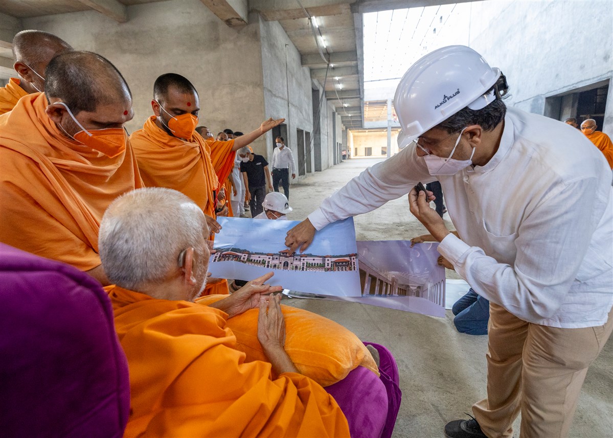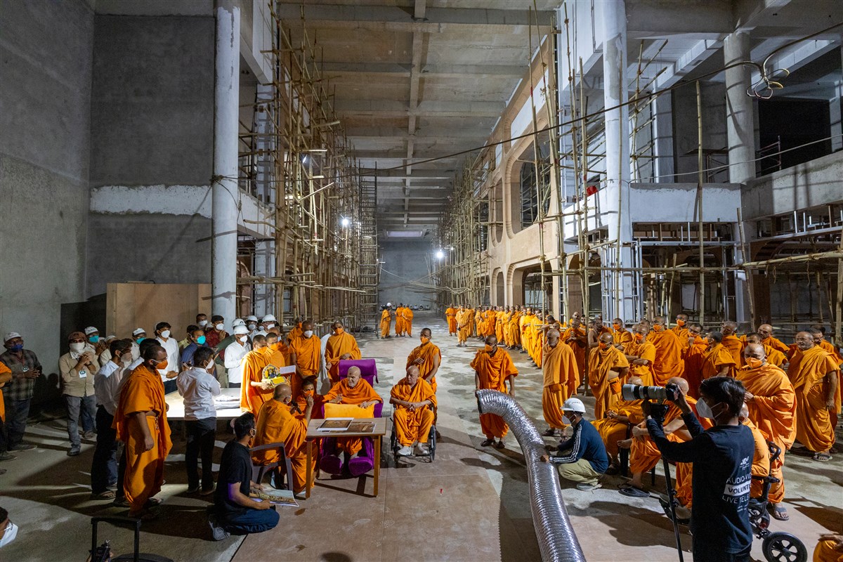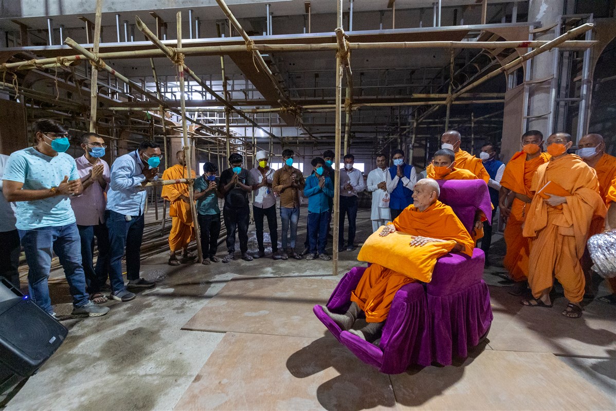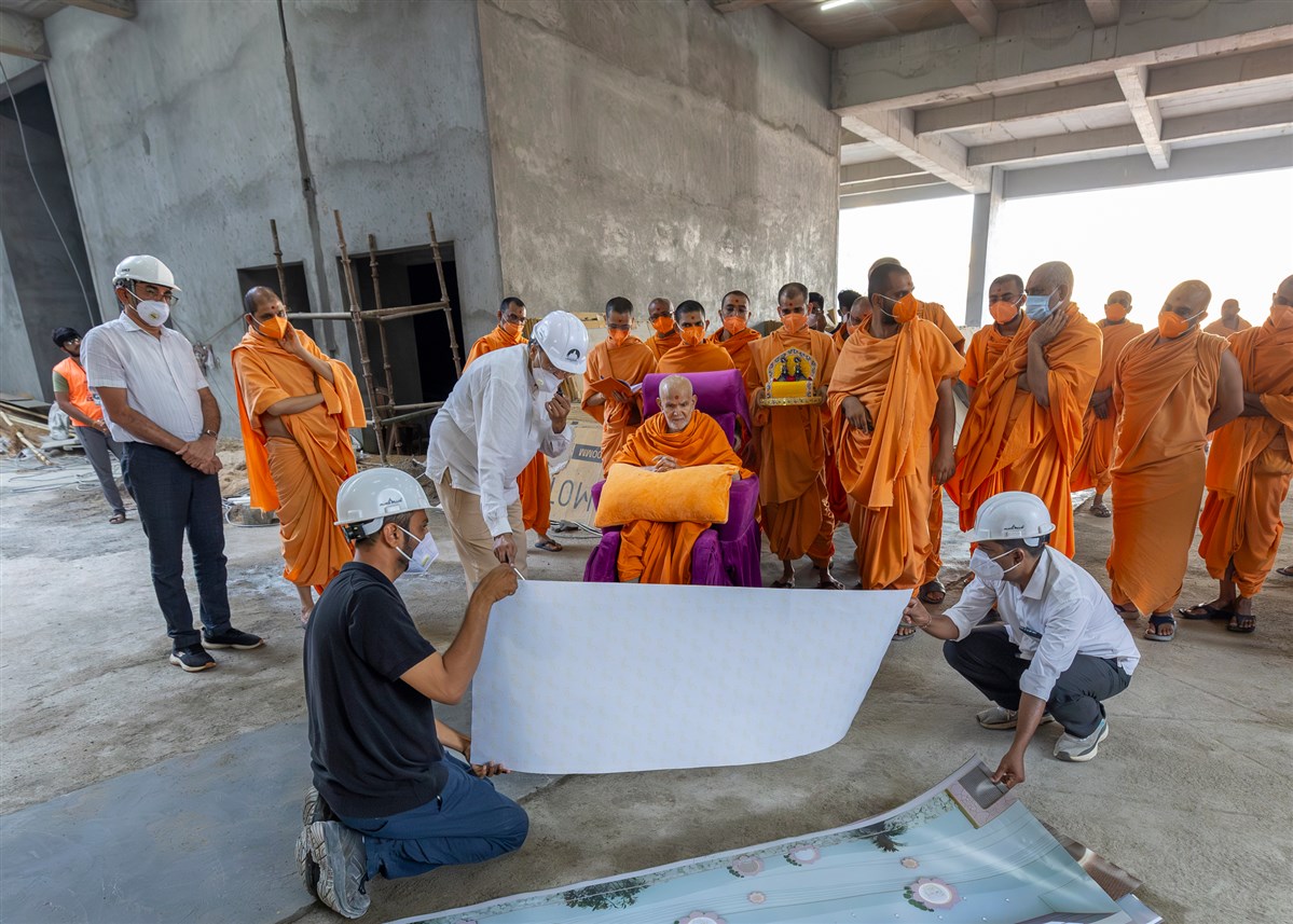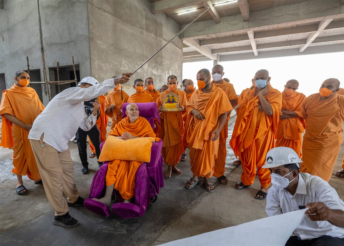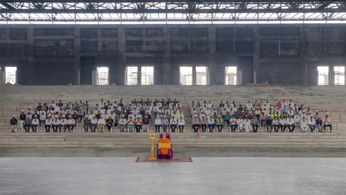 Pujya Ishwarcharan Swami at the under-construction Visitors' Centre