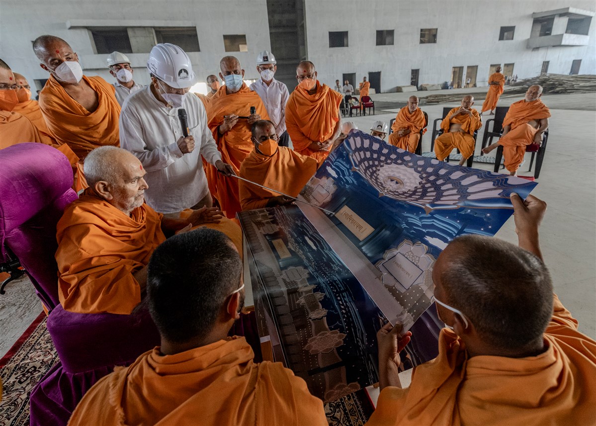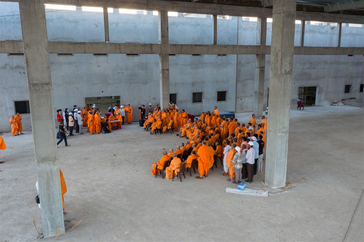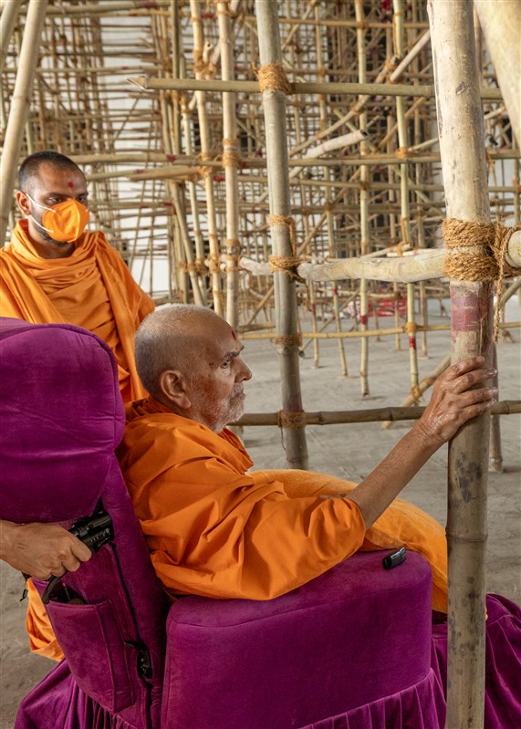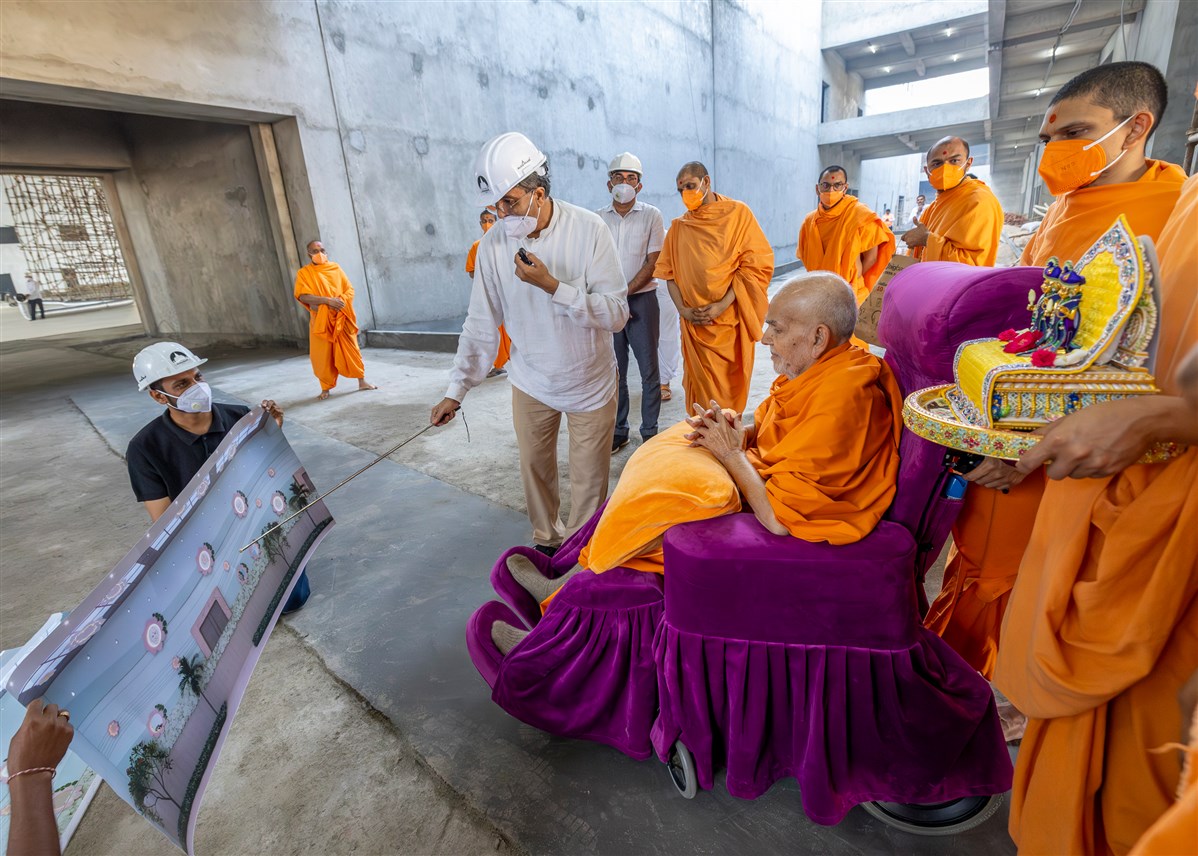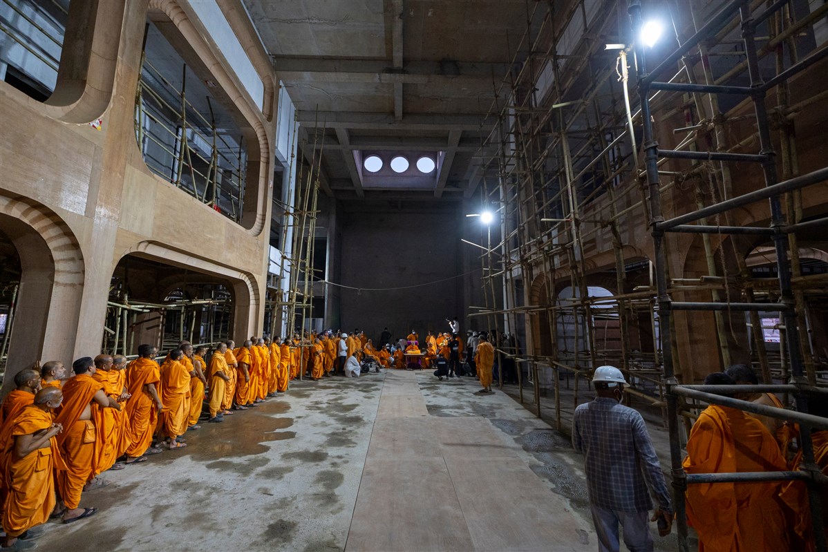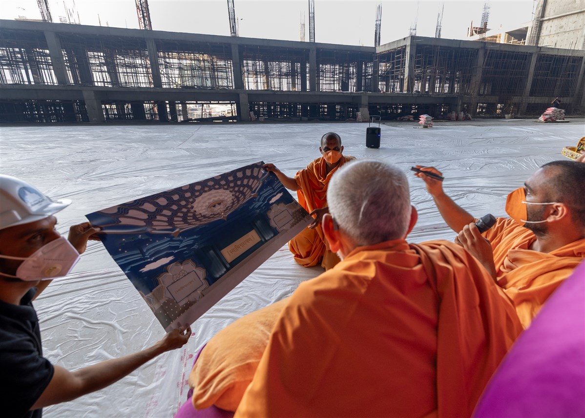 Pujya Ishwarcharan Swami at the under-construction Visitors' Centre