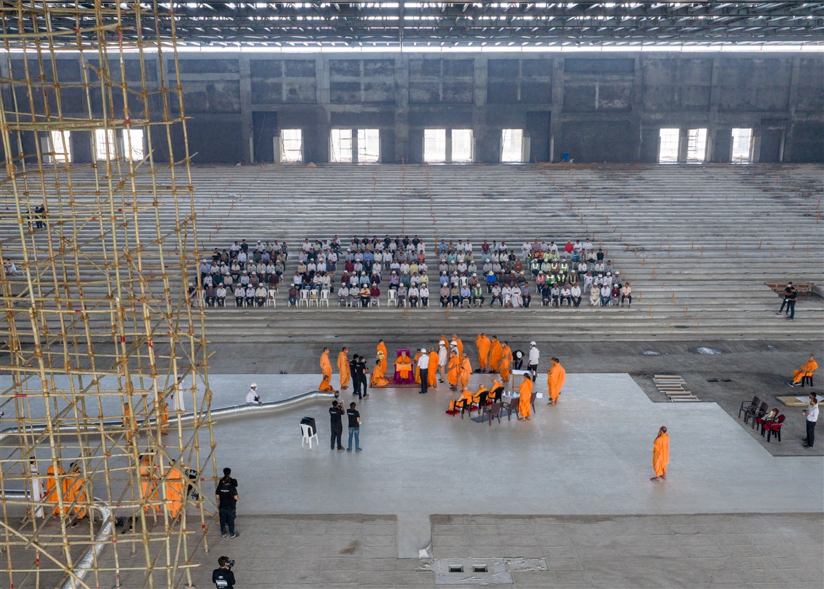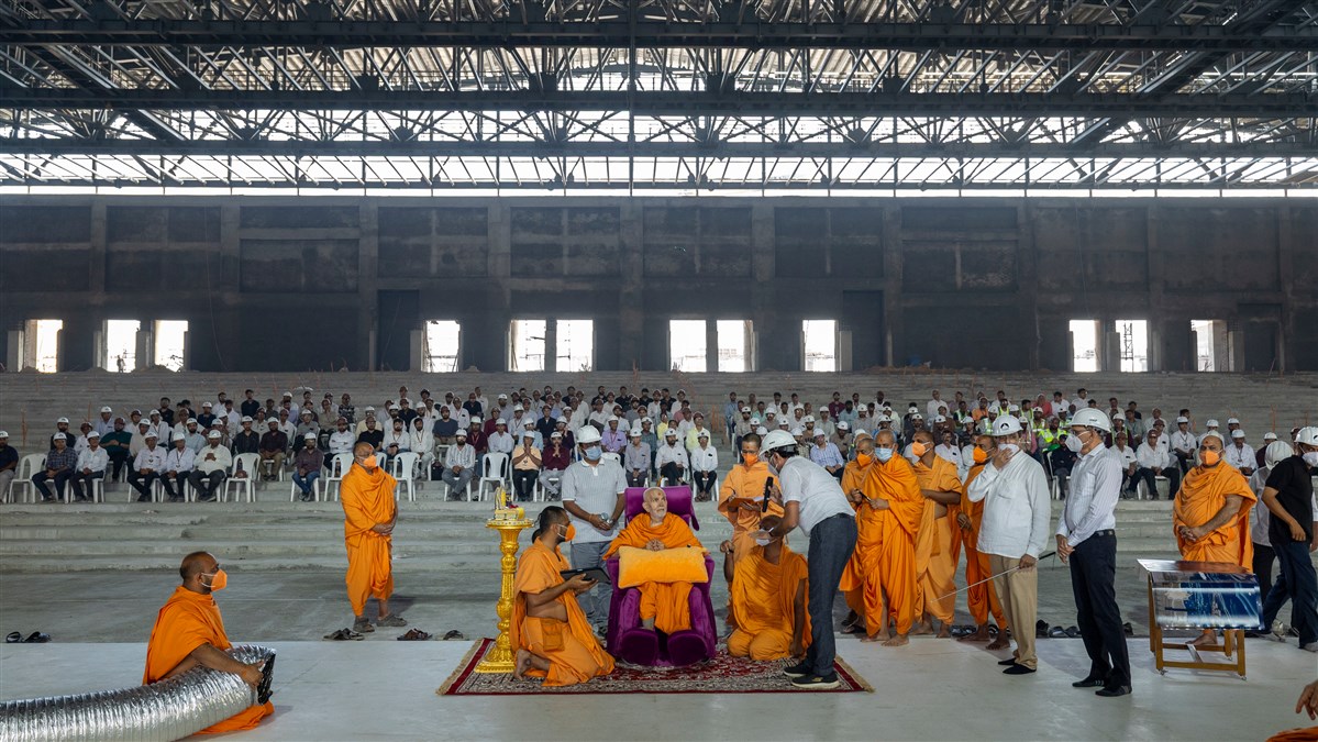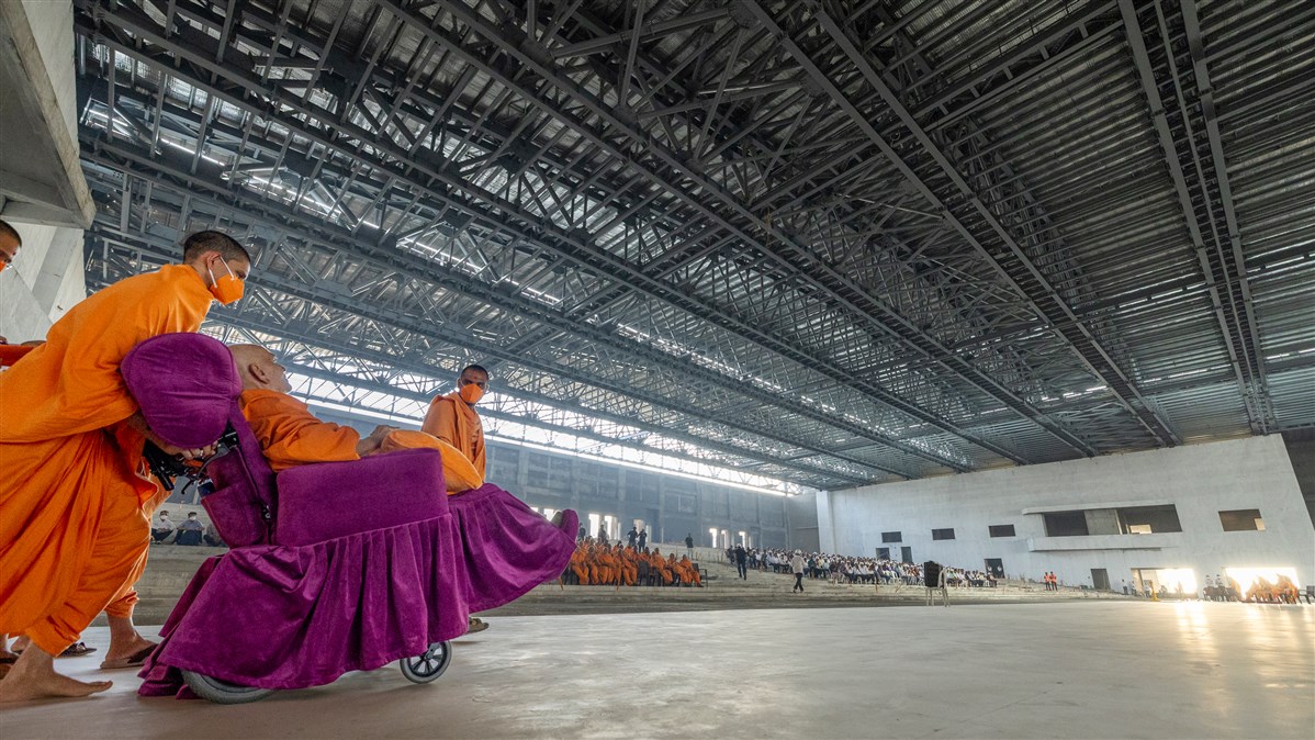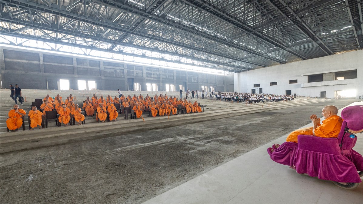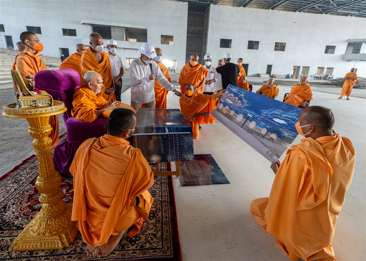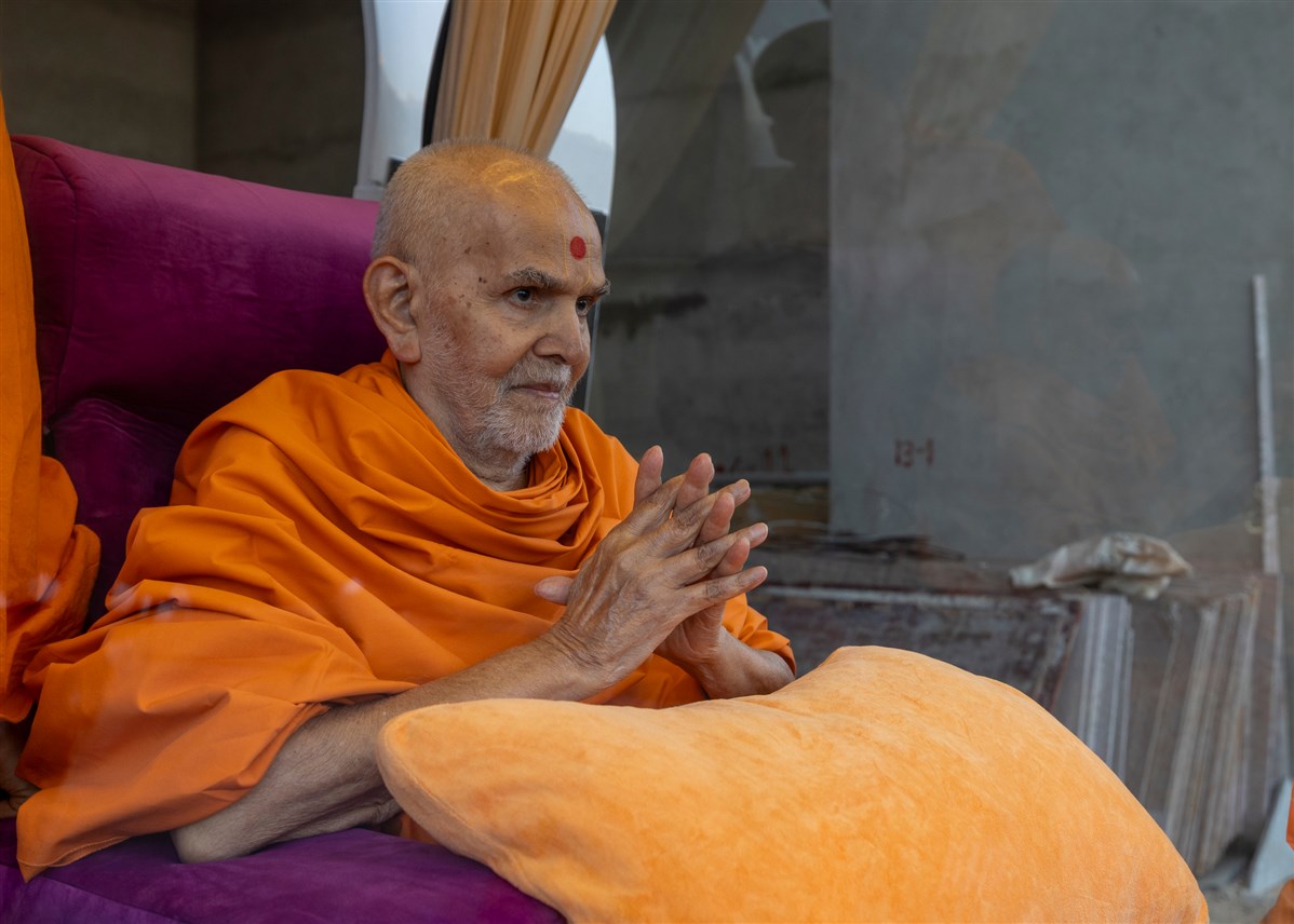 Pujya Ishwarcharan Swami at the under-construction Visitors' Centre