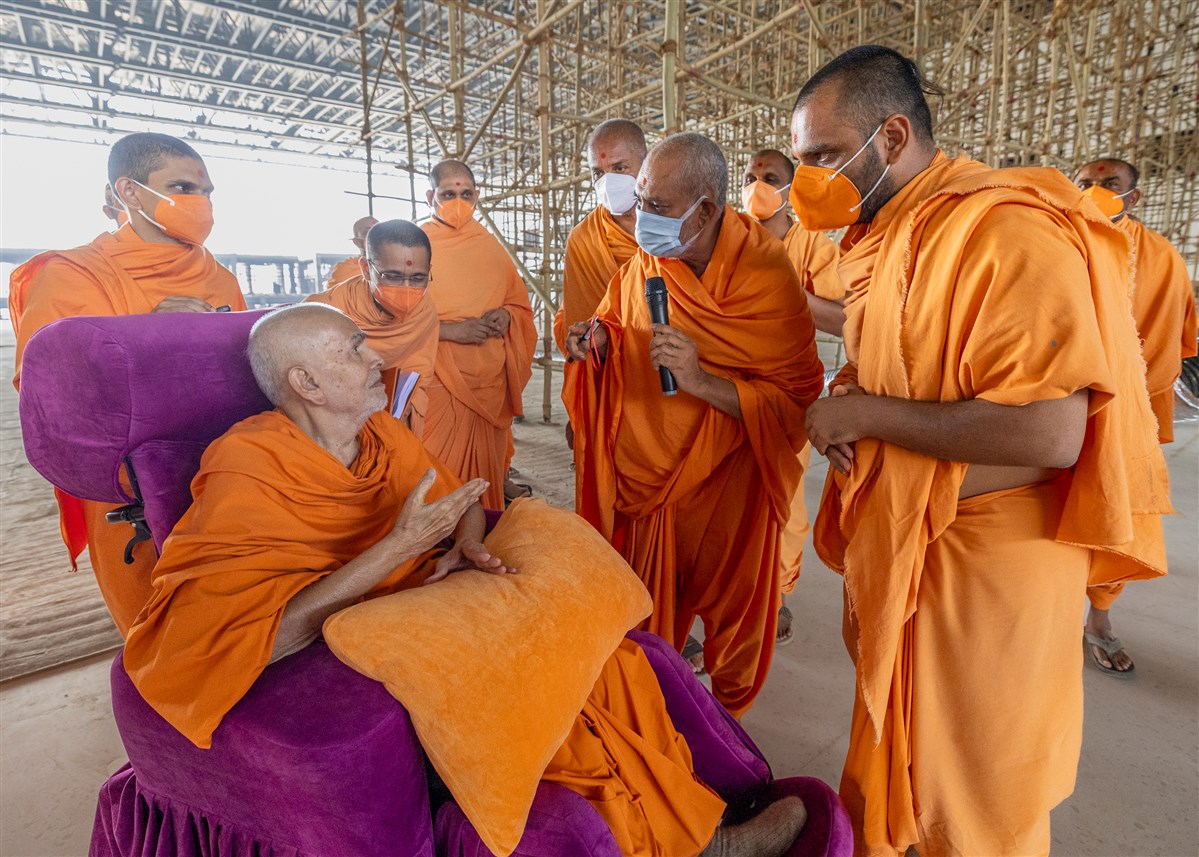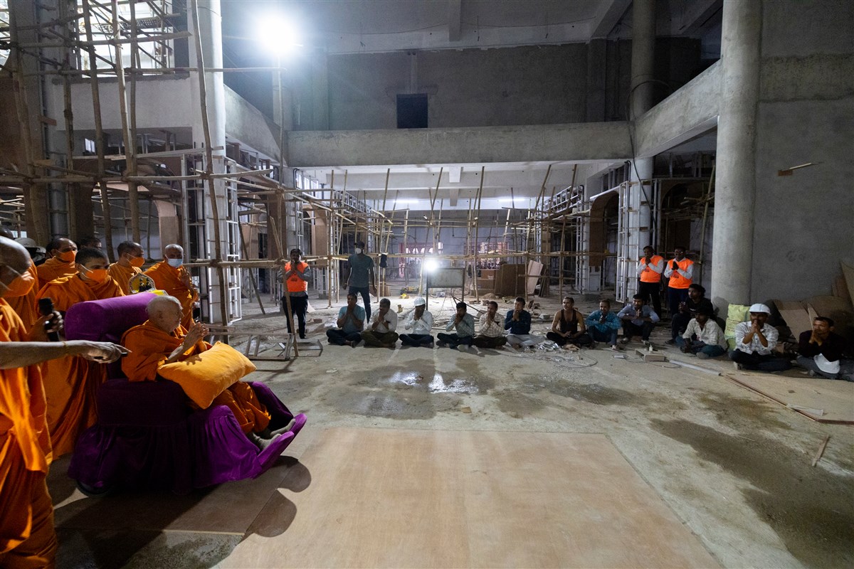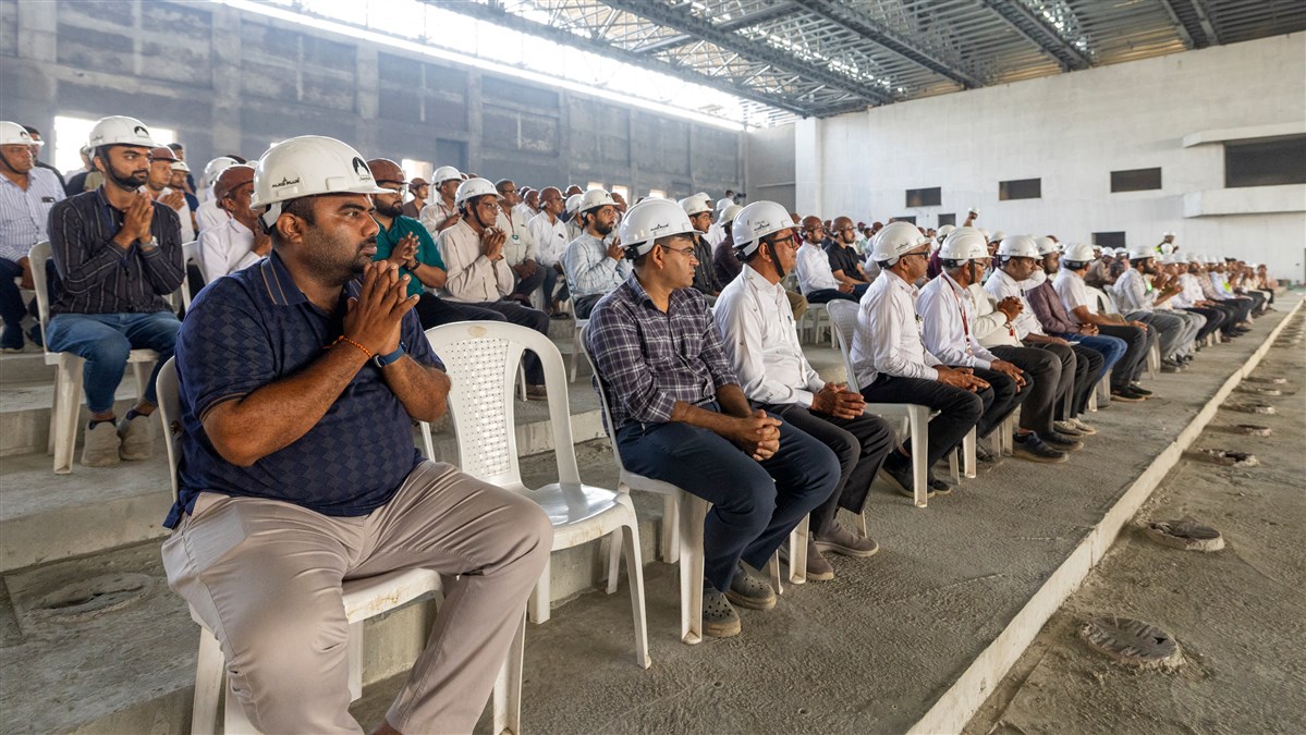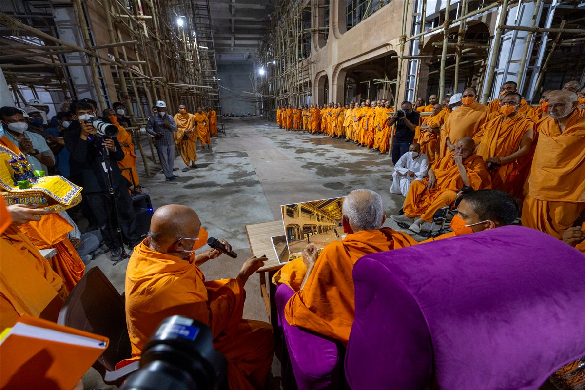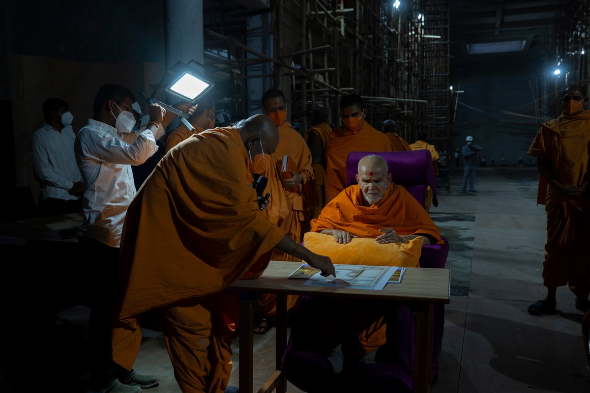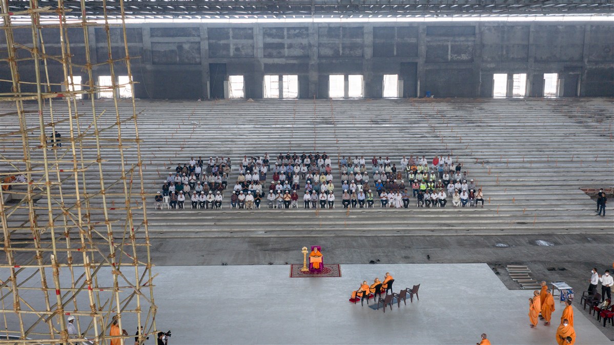 Pujya Ishwarcharan Swami at the under-construction Visitors' Centre