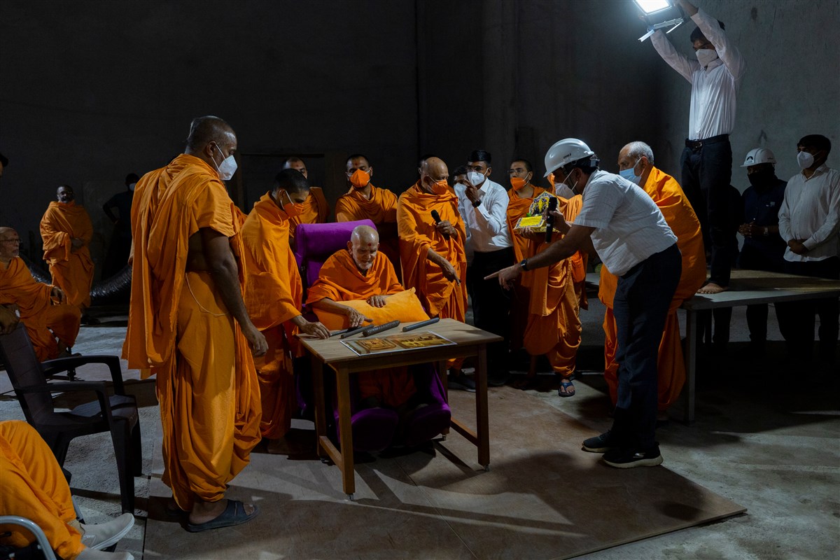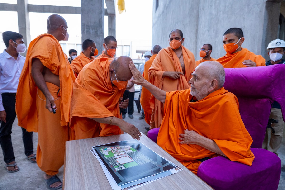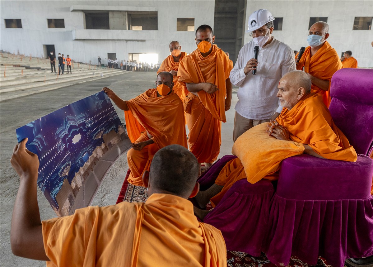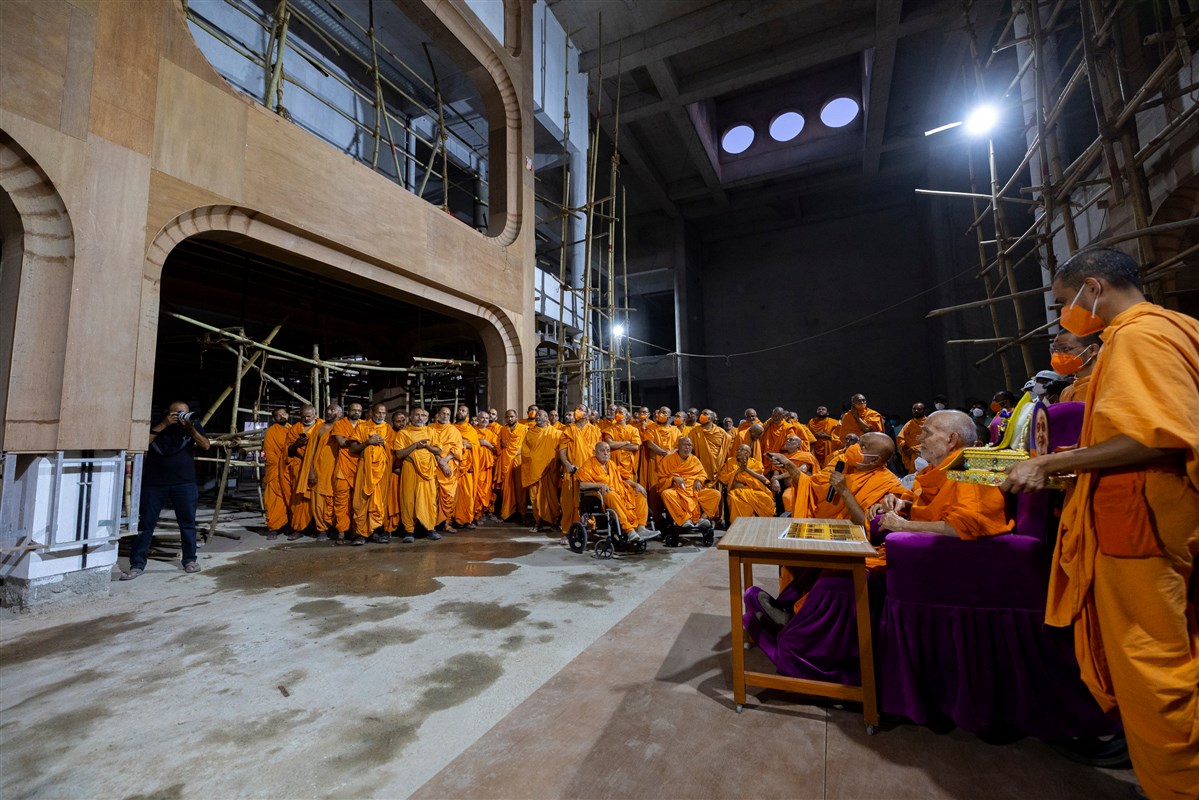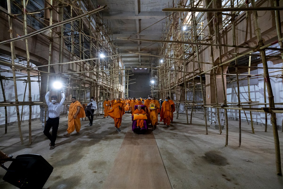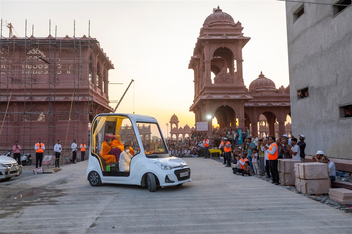 Pujya Ishwarcharan Swami at the under-construction Visitors' Centre