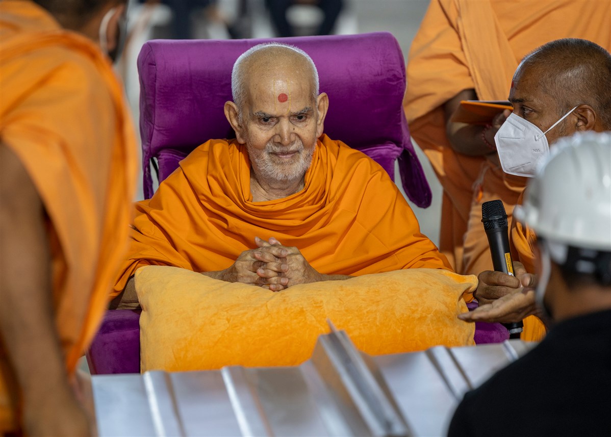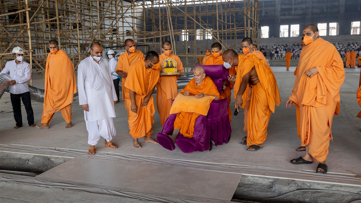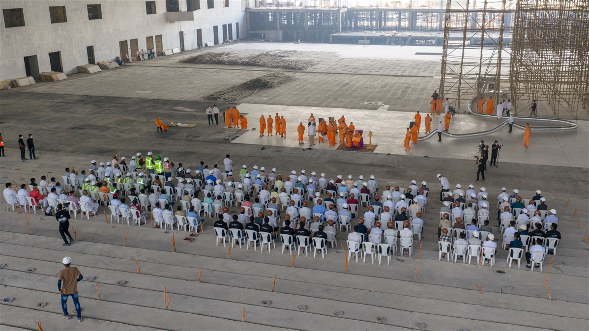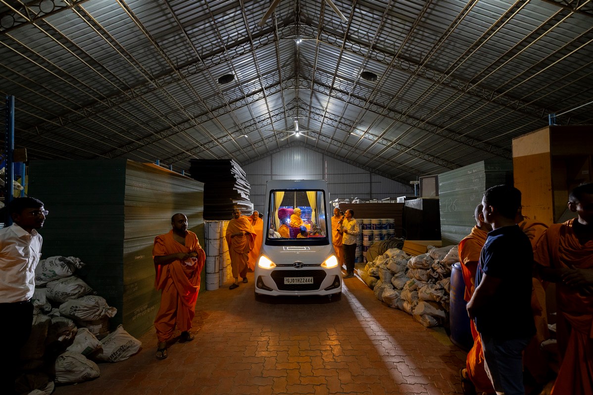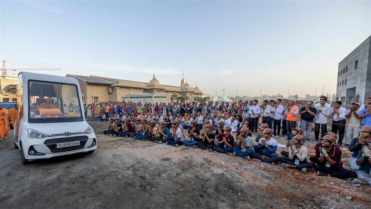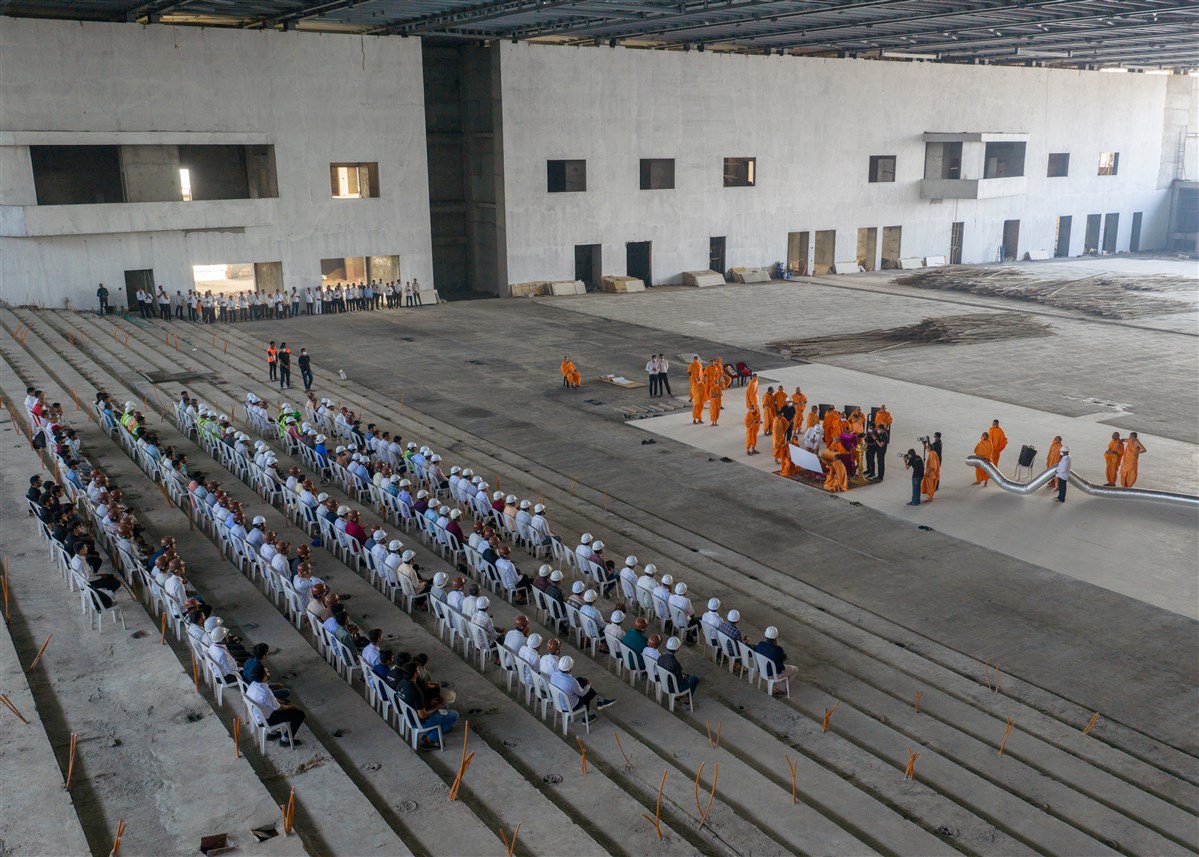 Pujya Ishwarcharan Swami at the under-construction Visitors' Centre