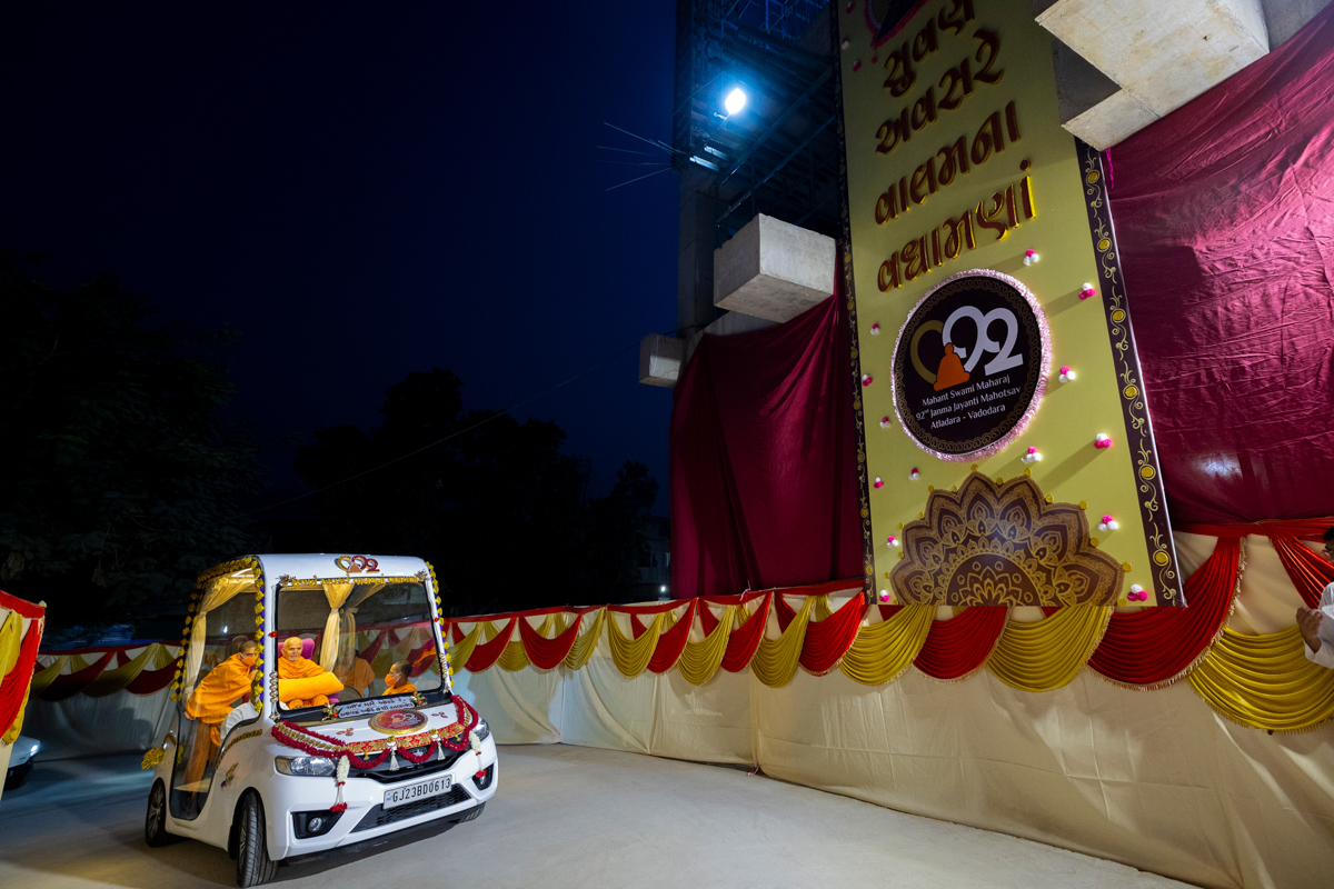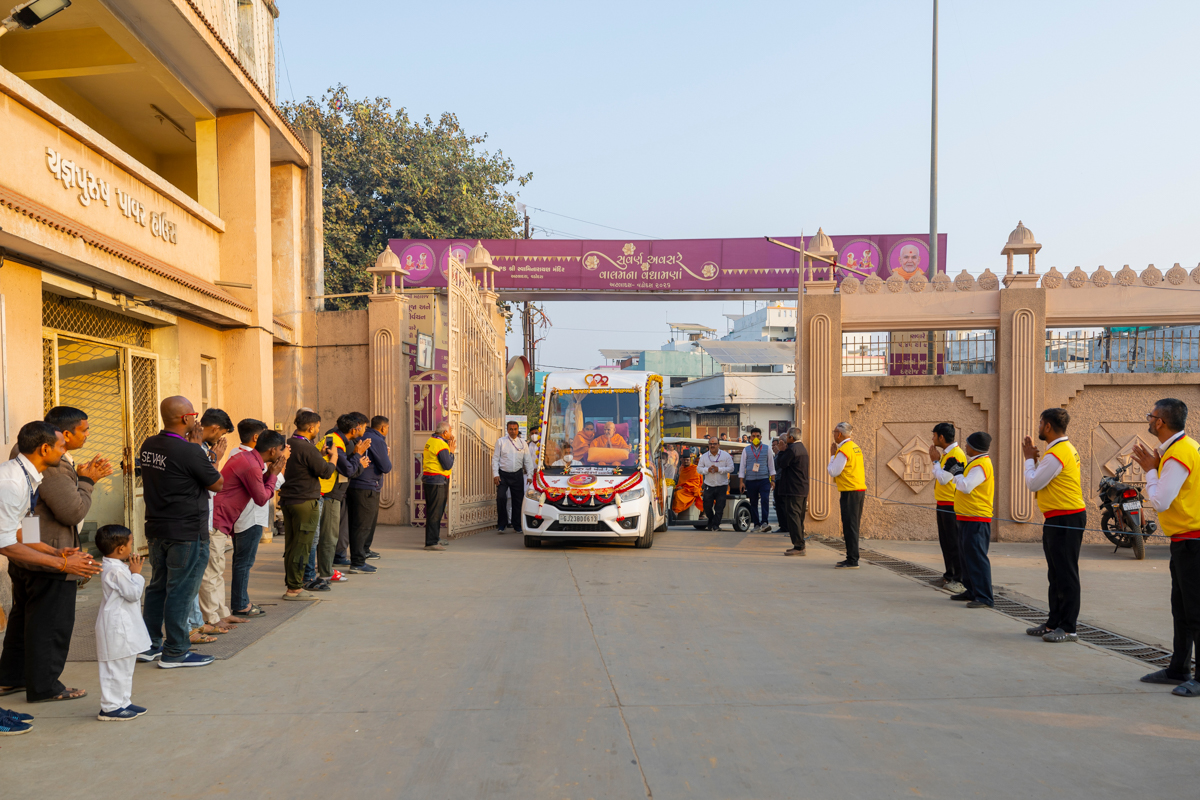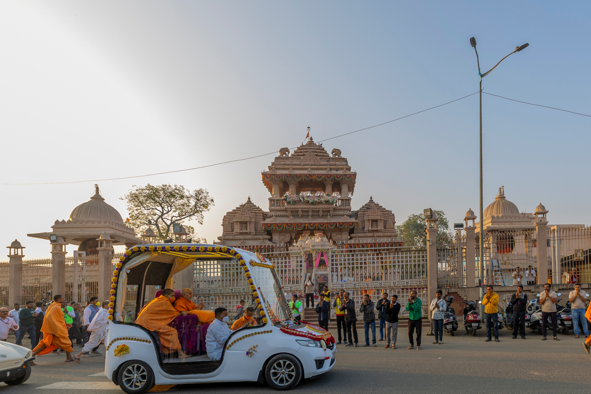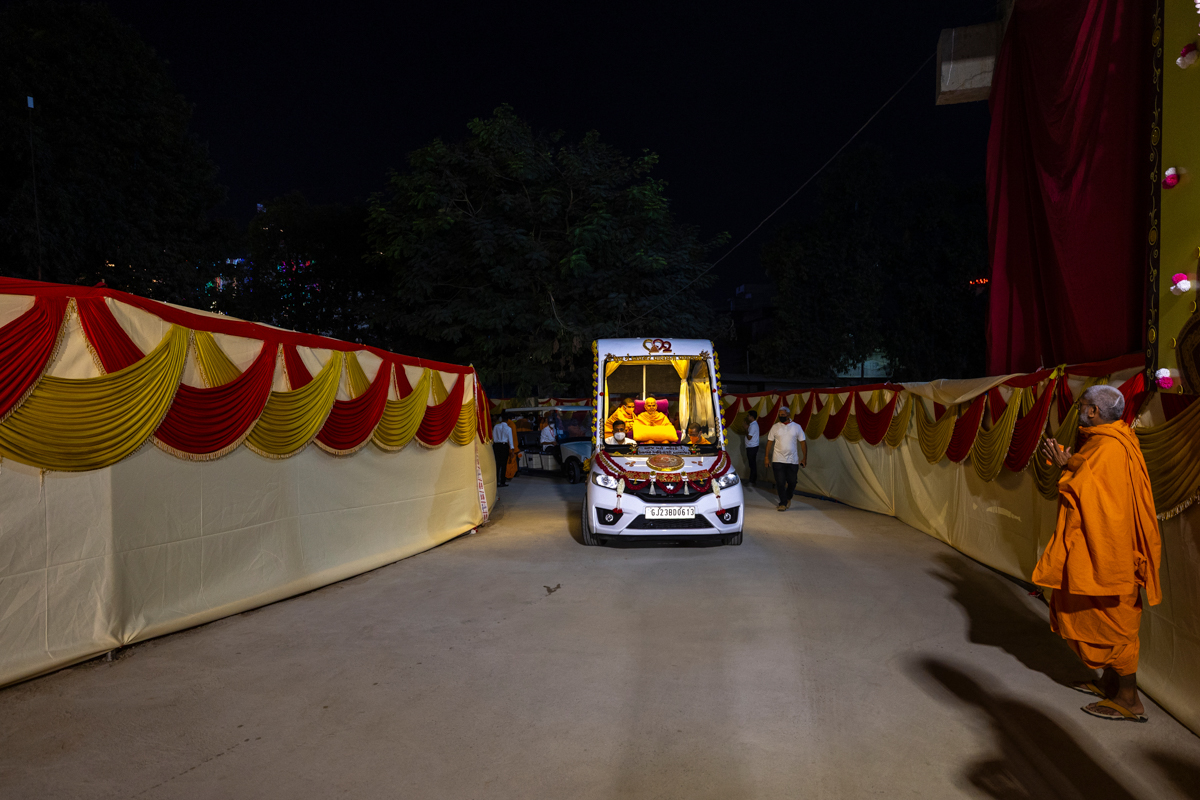 Swamishri returns to BAPS Shri Swaminarayan Mandir, Atladara (Vadodara), after his daily puja