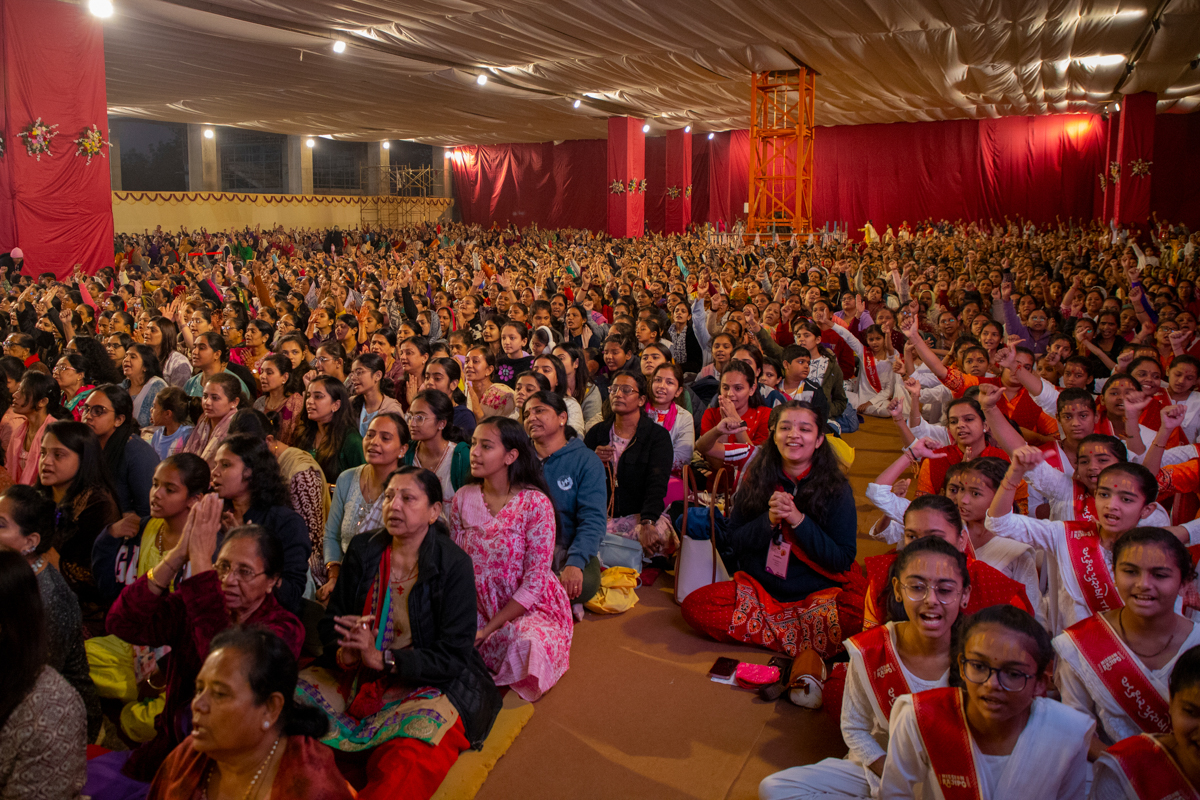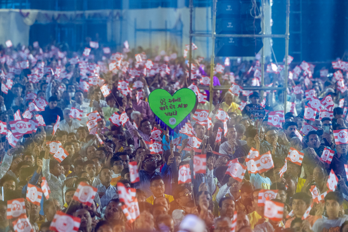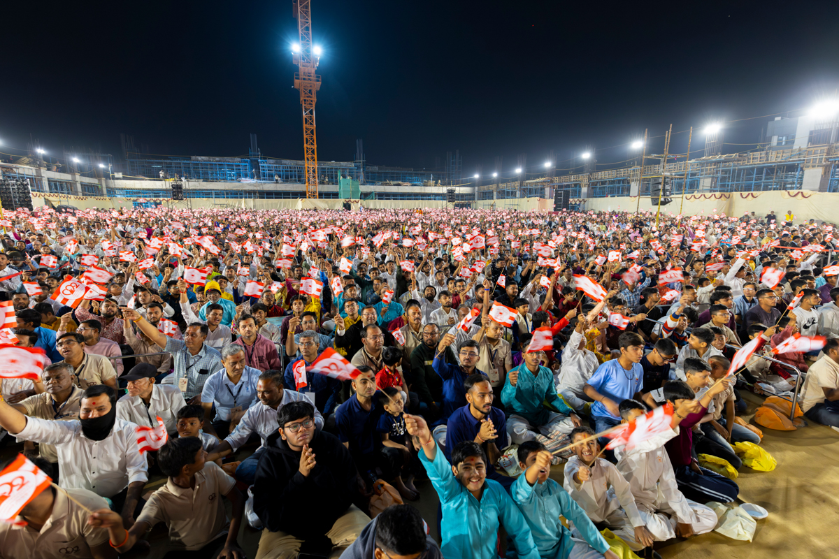 Devotees wave flags to welcome Swamishri in the assembly