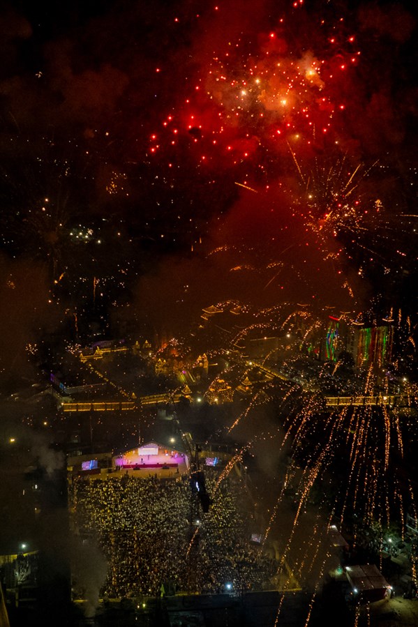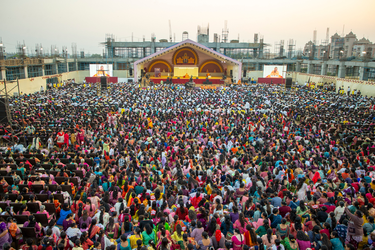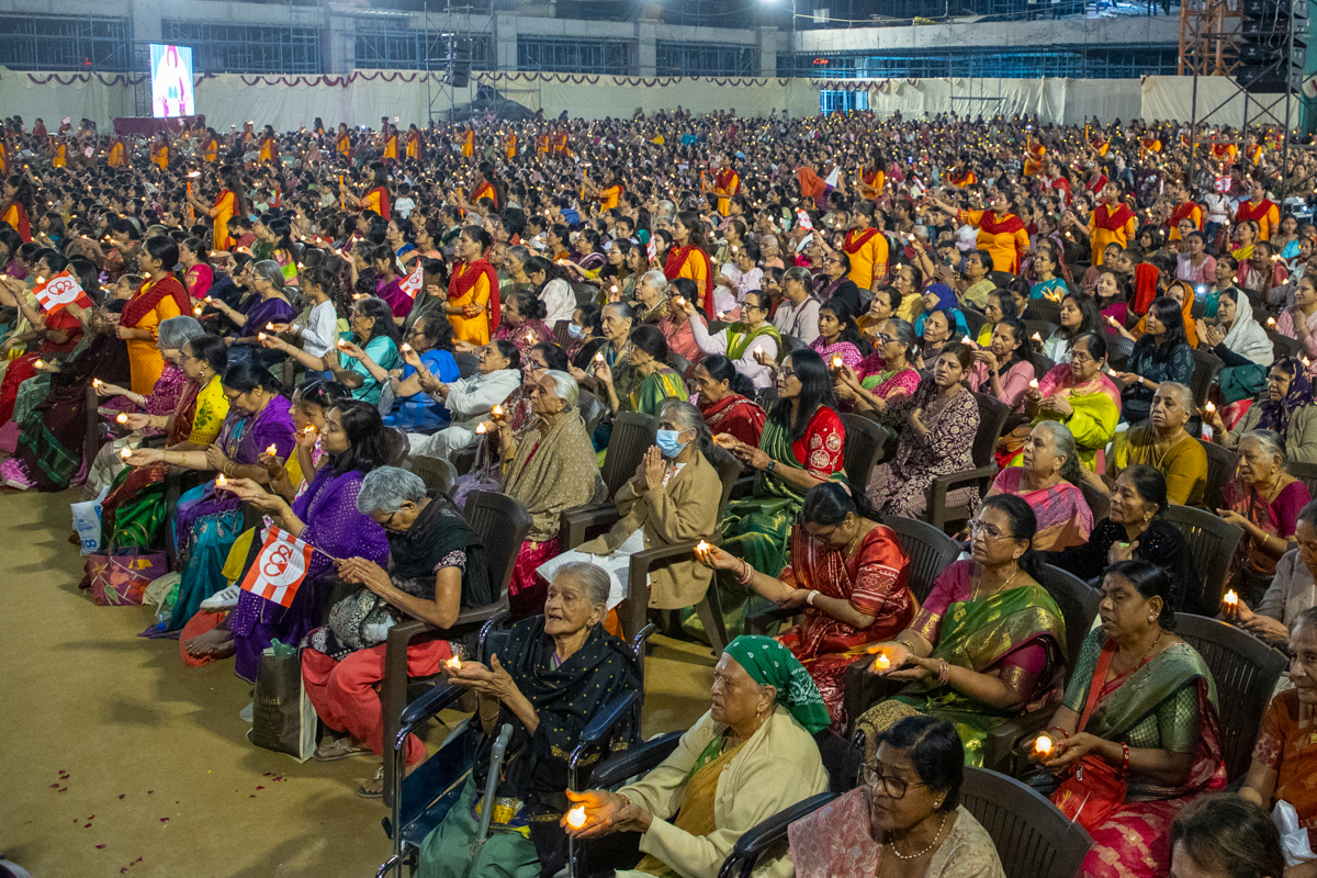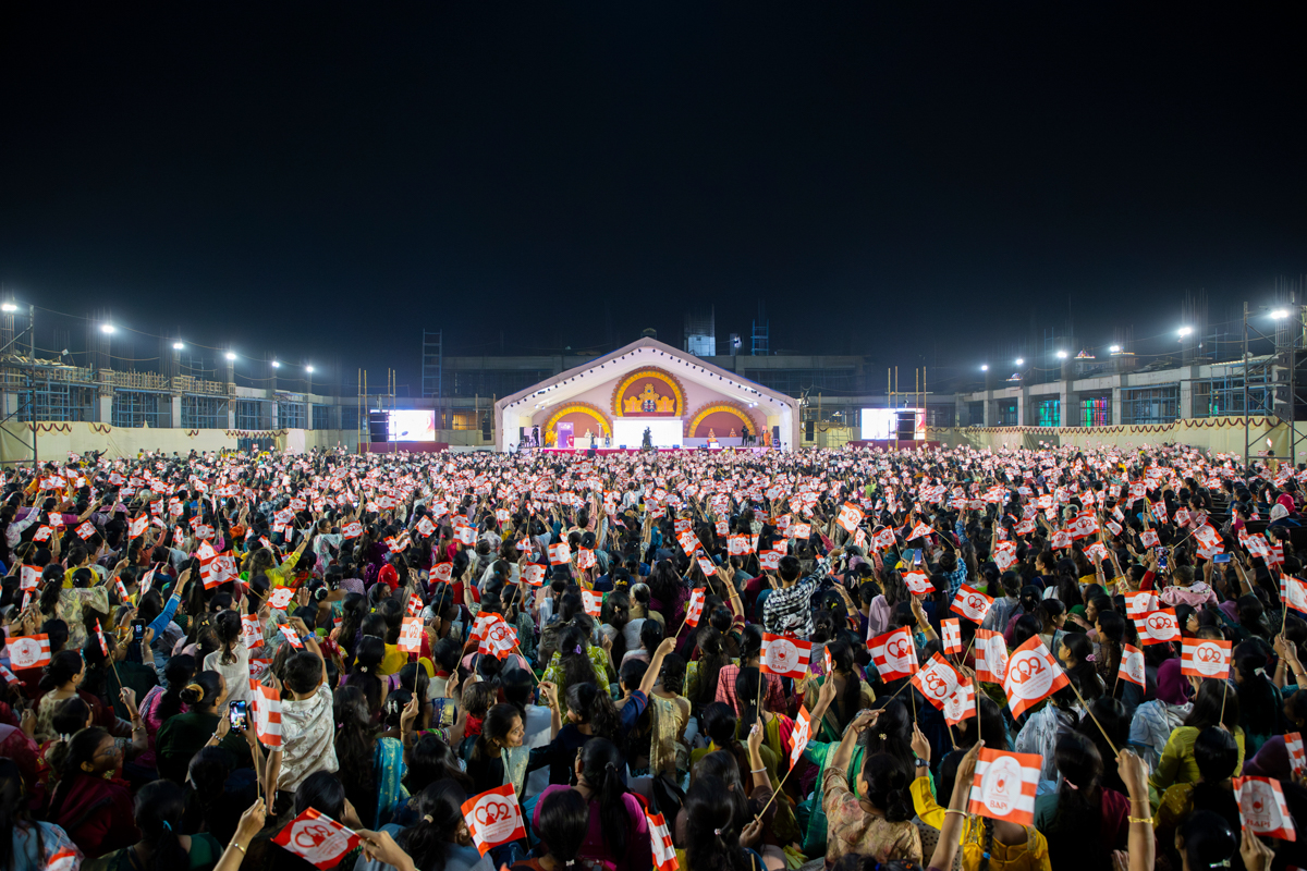 Devotees wave flags to welcome Swamishri in the assembly