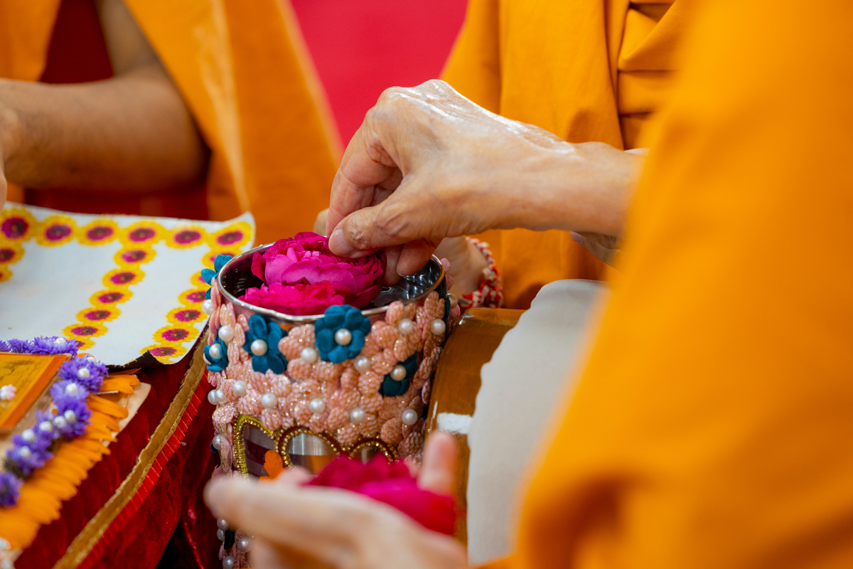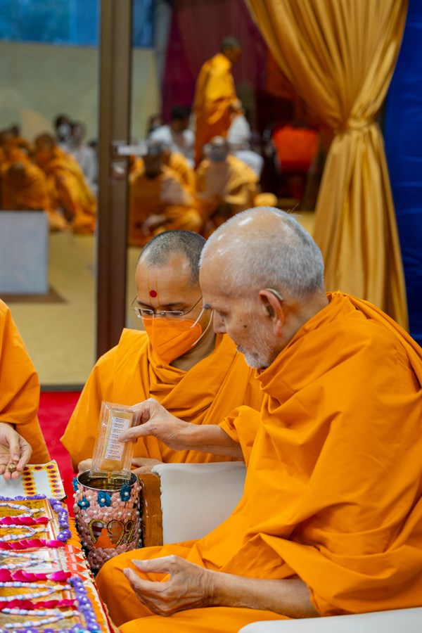 Swamishri adds flowers to the sanctified water