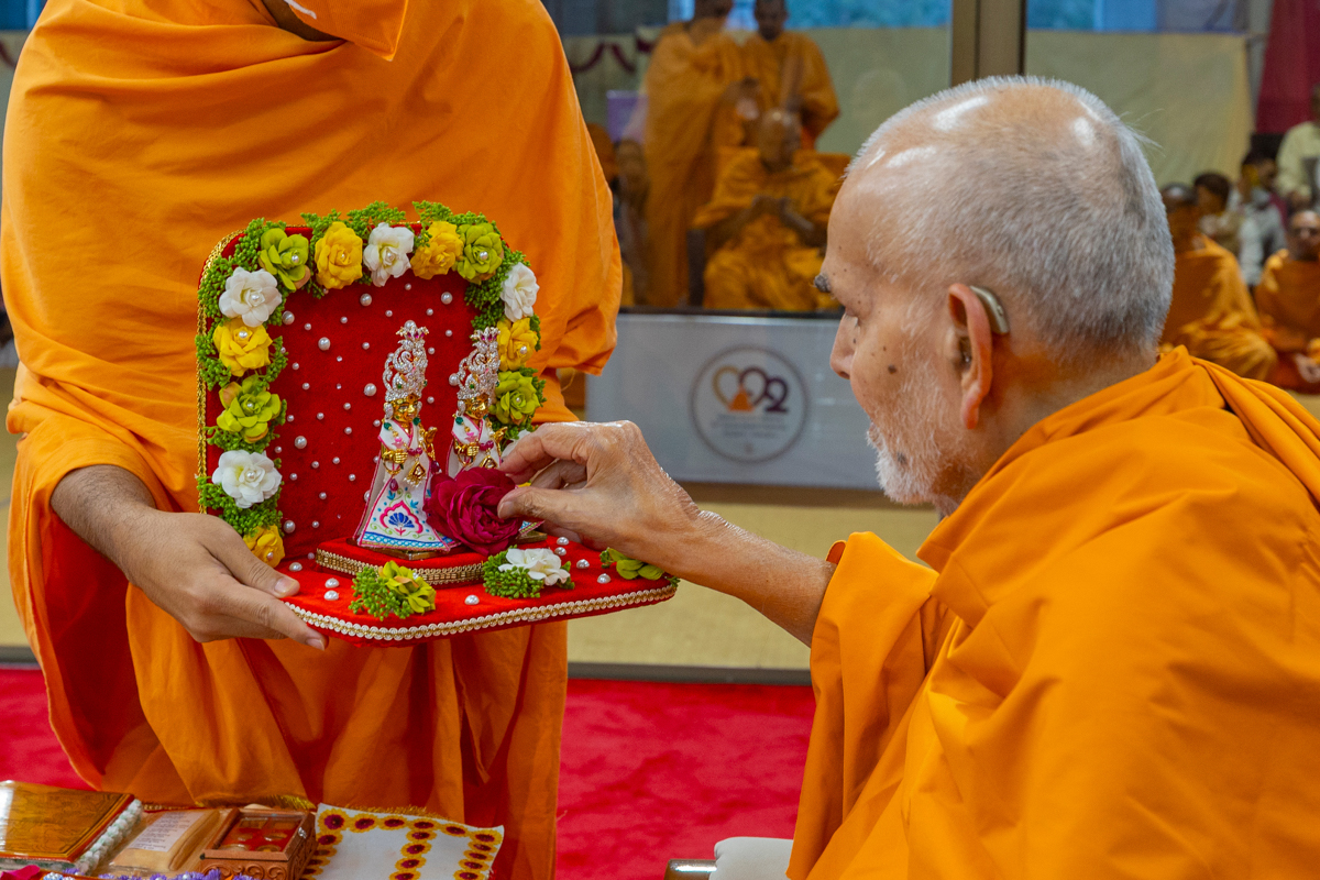 Swamishri places a flower at the feet of Shri Harikrishna Maharaj and Shri Gunatitanand Swami Maharaj
