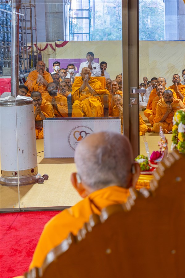 Pujya Tyagvallabh Swami and swamis doing darshan of Swamishri