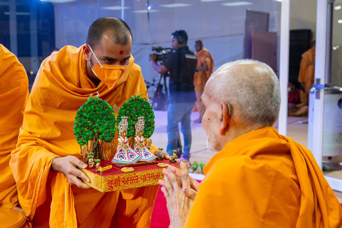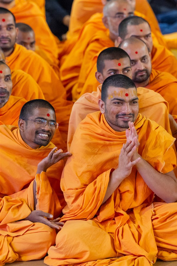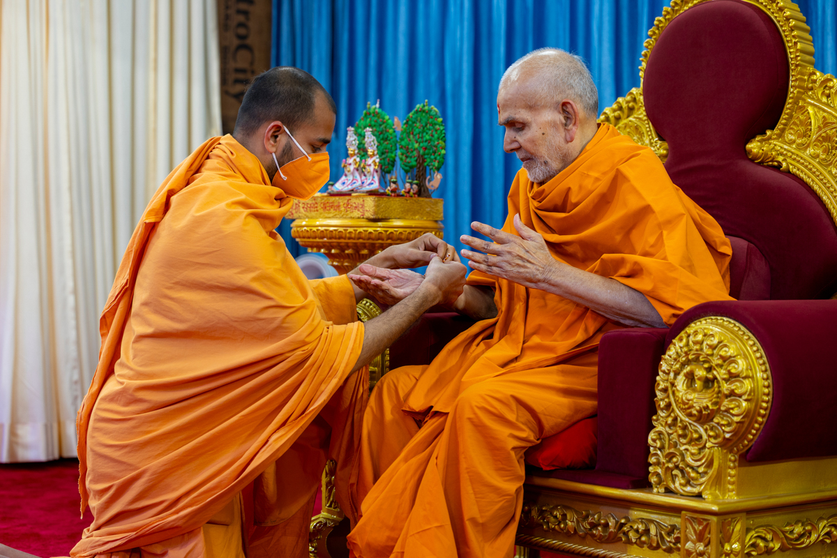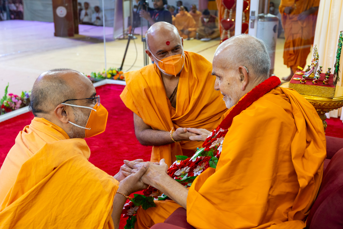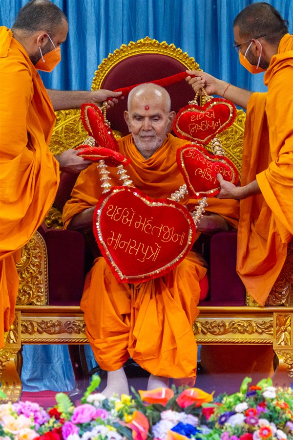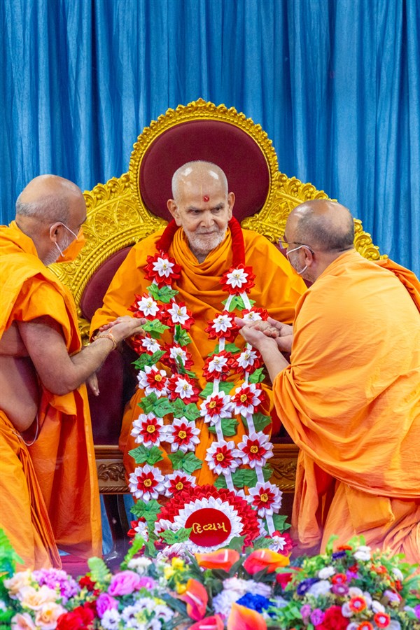 Swamis honor Swamishri with a garland