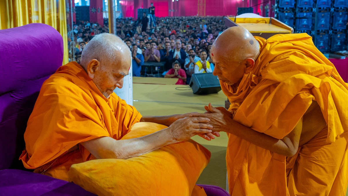 Pujya Tyagvallabh Swami greets Swamishri