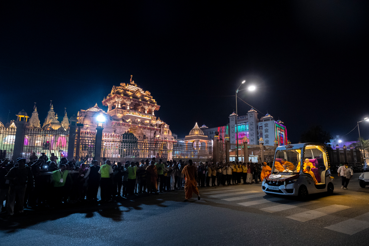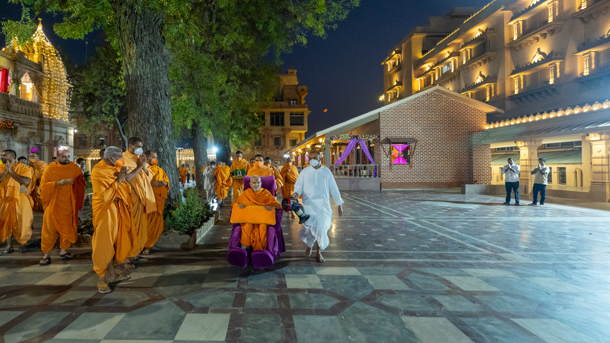 Swamishri on his way to the evening assembly
